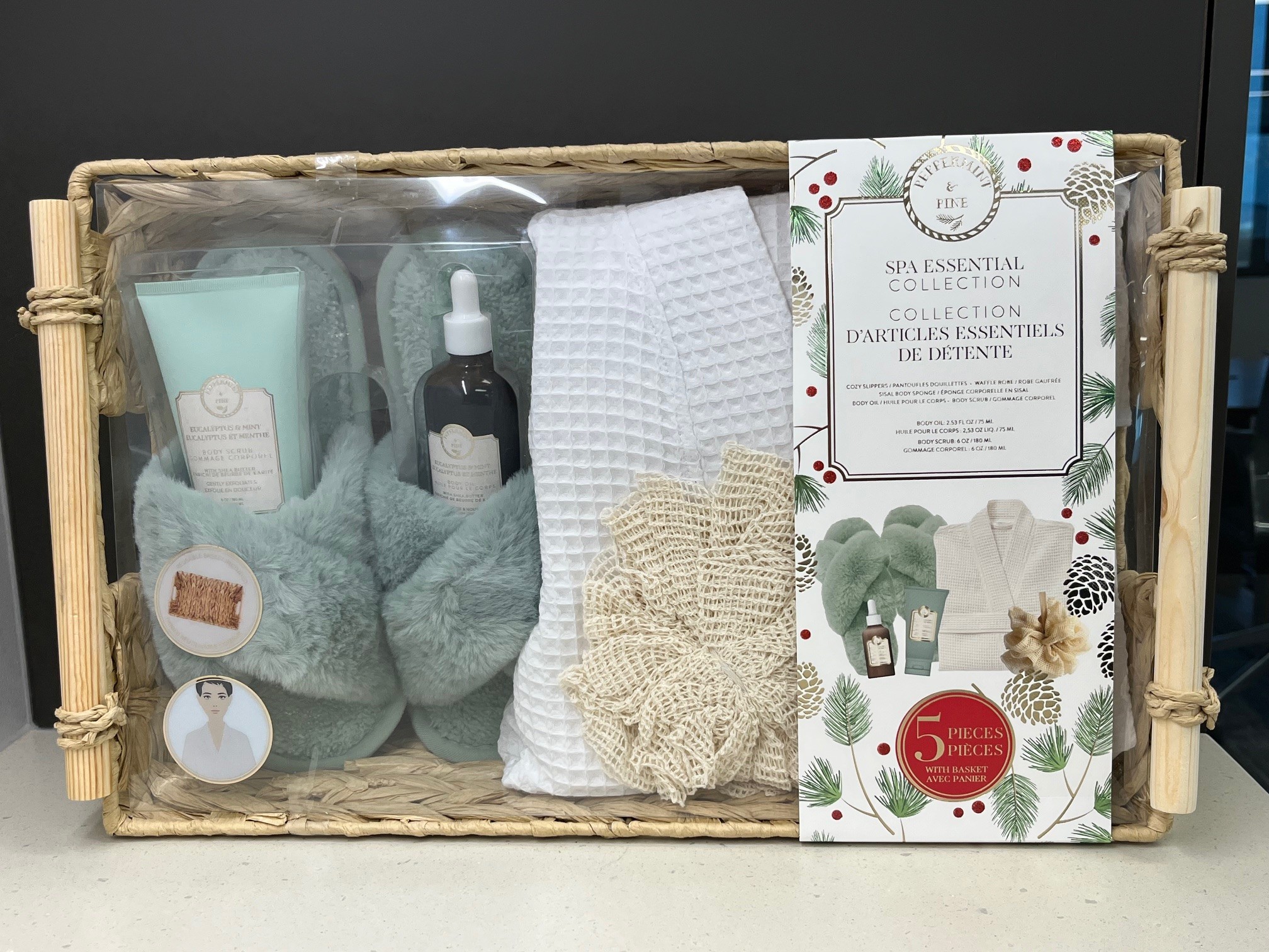 Cozy slippers, waffle robe, sisal body sponge, body oil, and body scrub