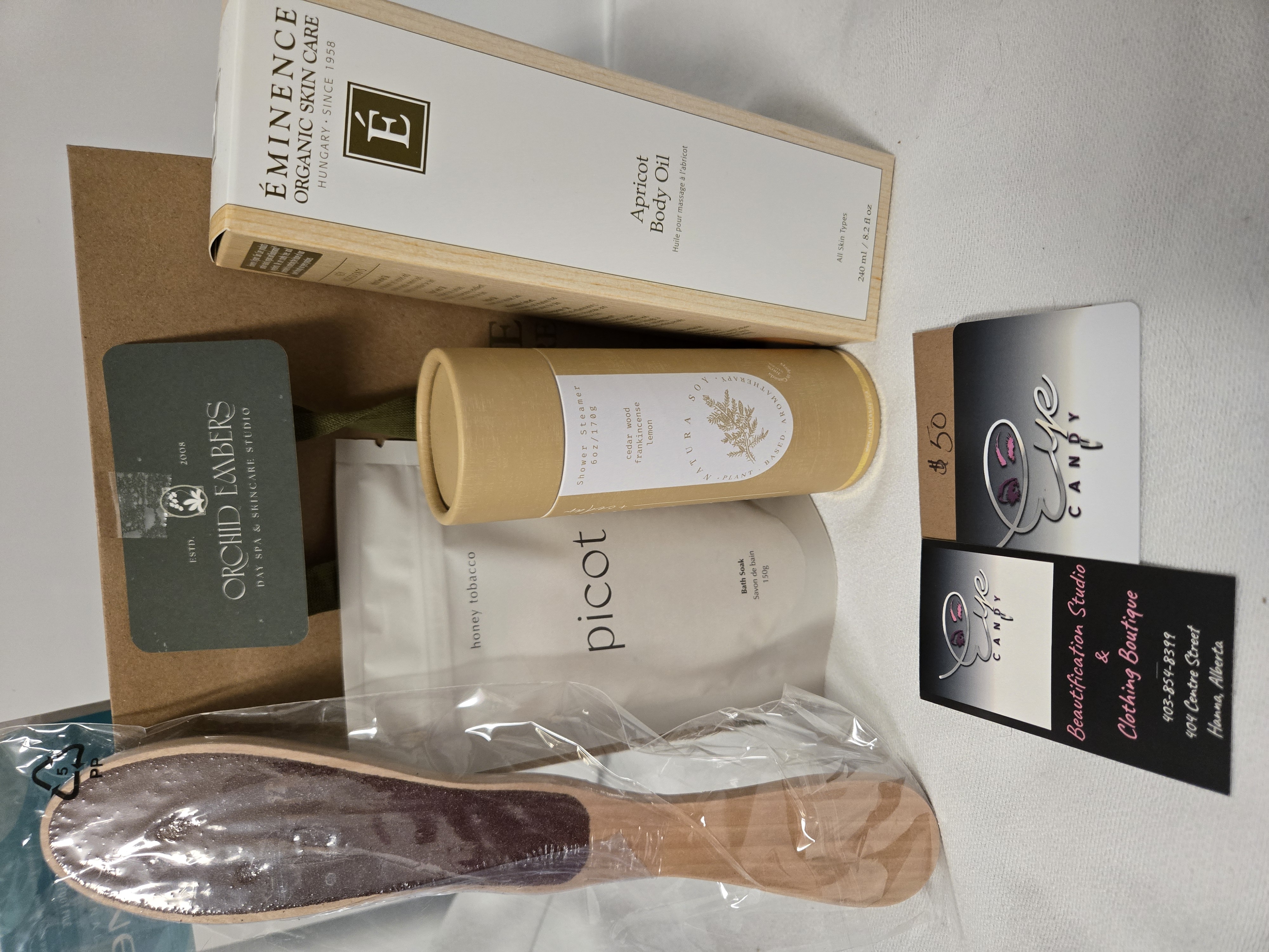 Why not spoil yourself or a loved with this care package. Package includes: apricot body oil, bath salts, foot file, shower steamers from Orchid Embers Spa and a $50 gift card from Eye Candy.