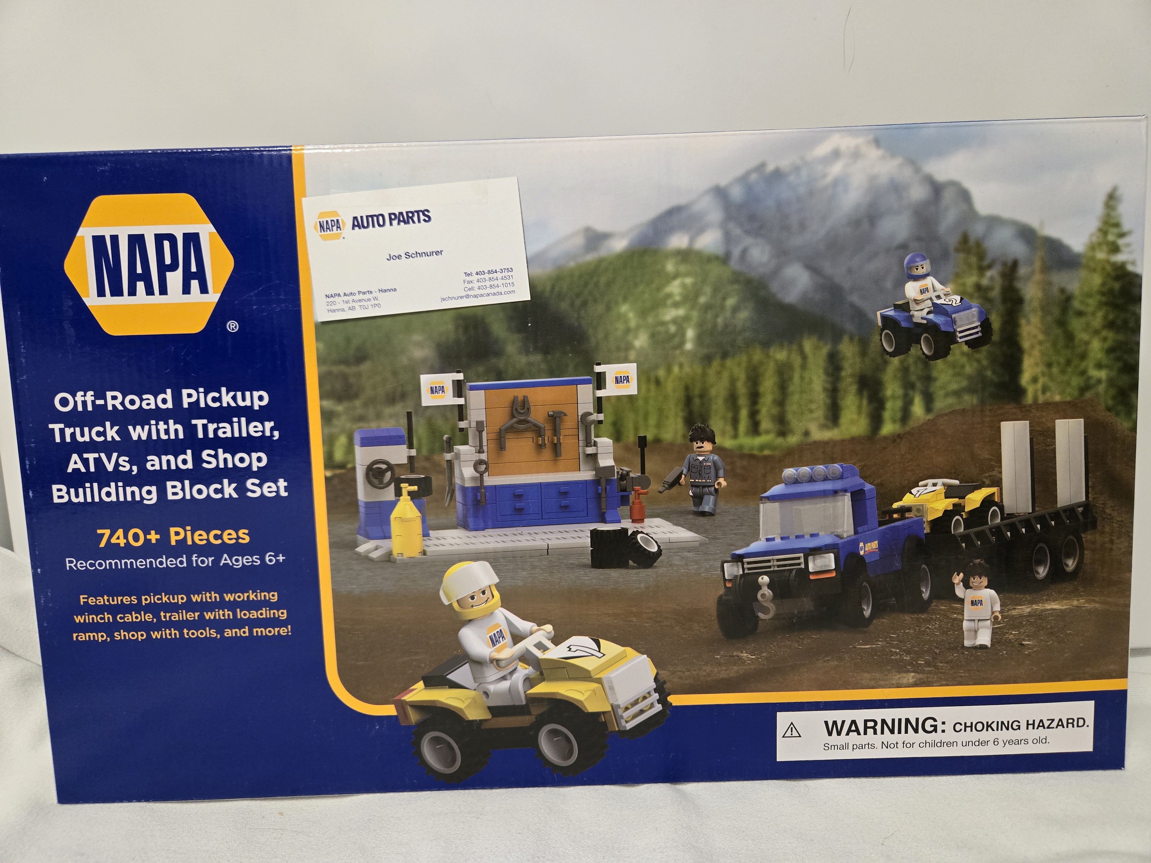 Spend hours of fun building and rebuilding this off-road truck with trailer, ATVs and shop from NAPA.