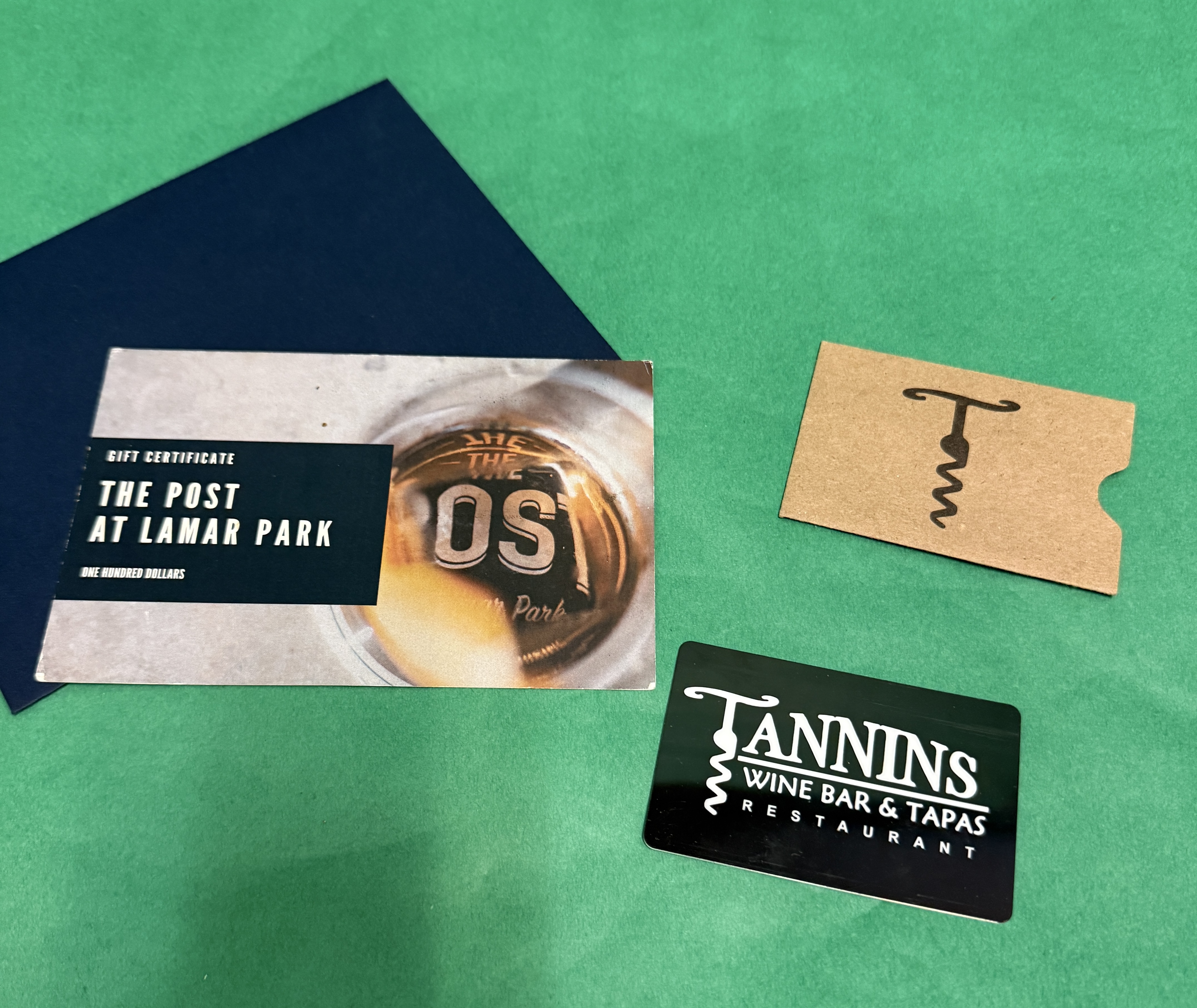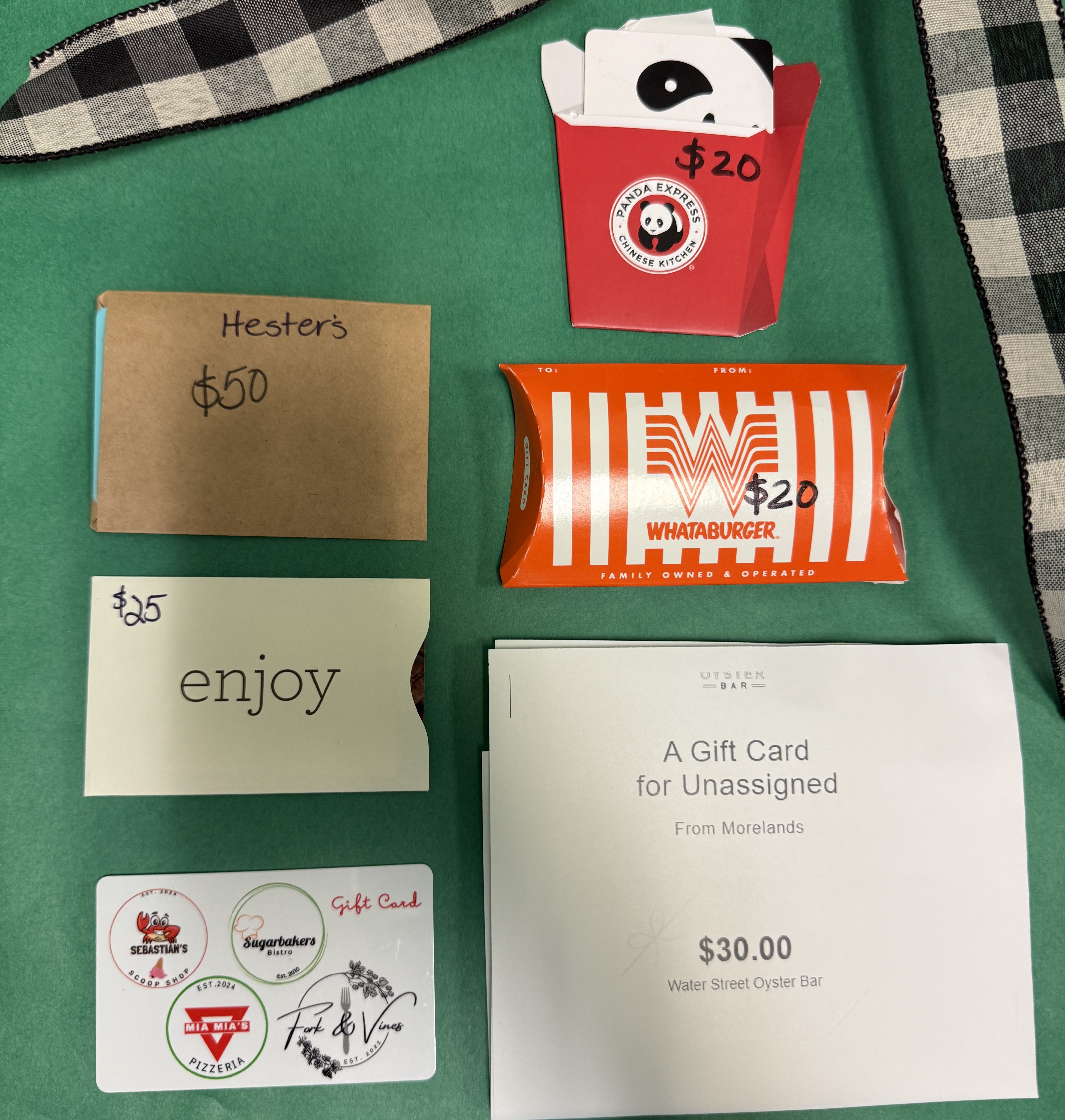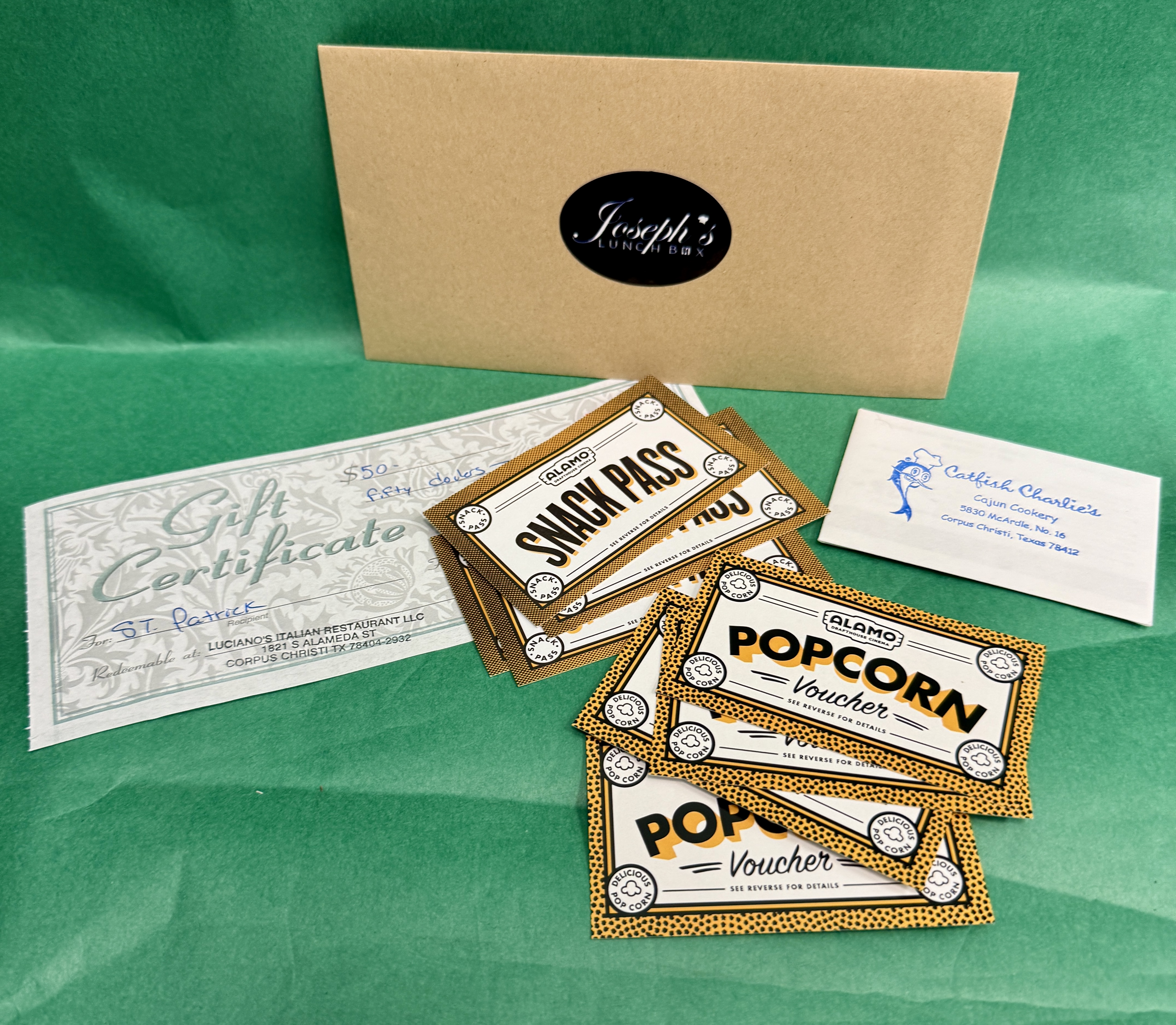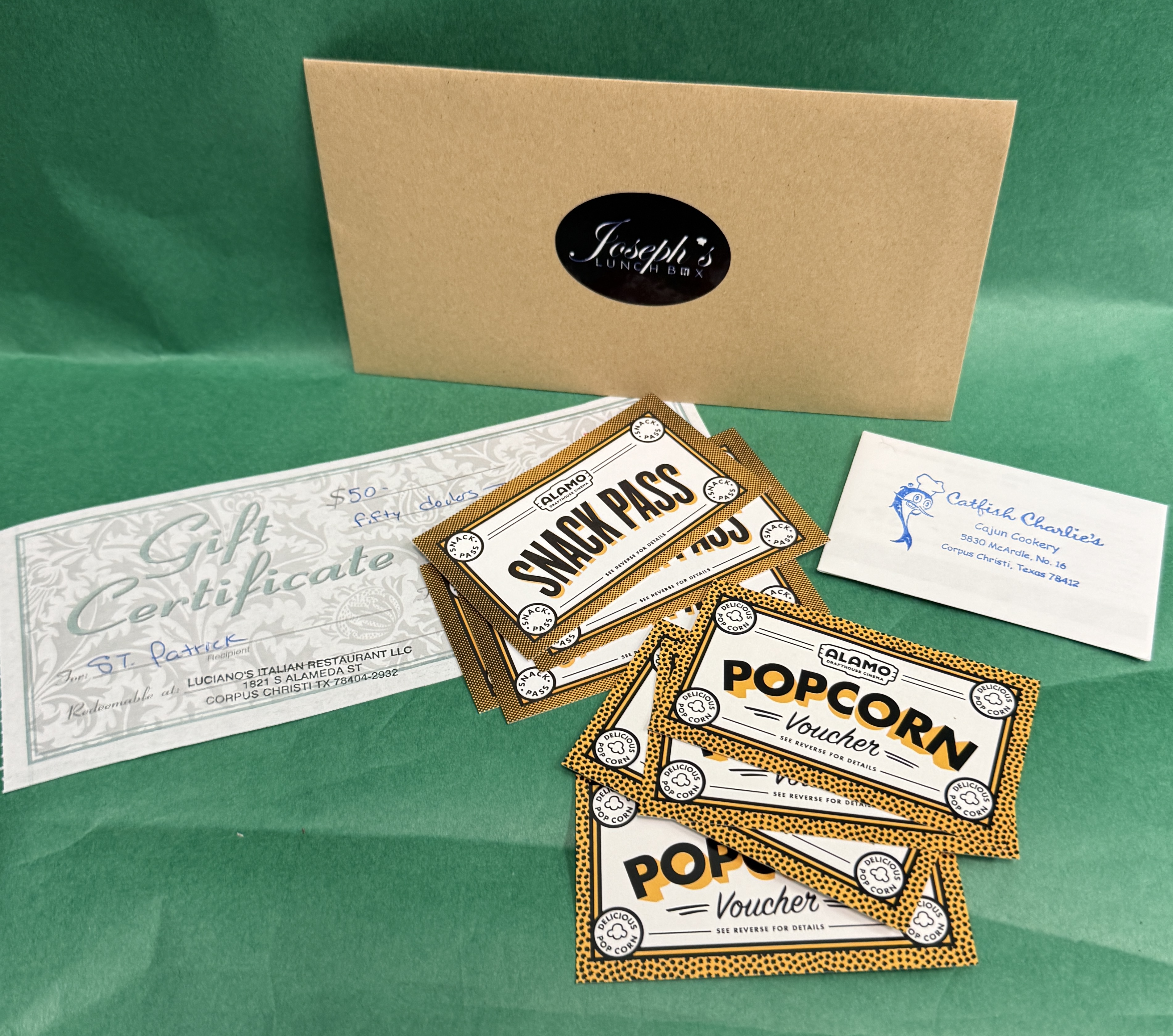 Luciano's-$50, Joseph's Lunch Box-$25, Catfish Charlie's-$25, Alamo Drafthouse- $80(snack pass-4, popcorn voucher-4)