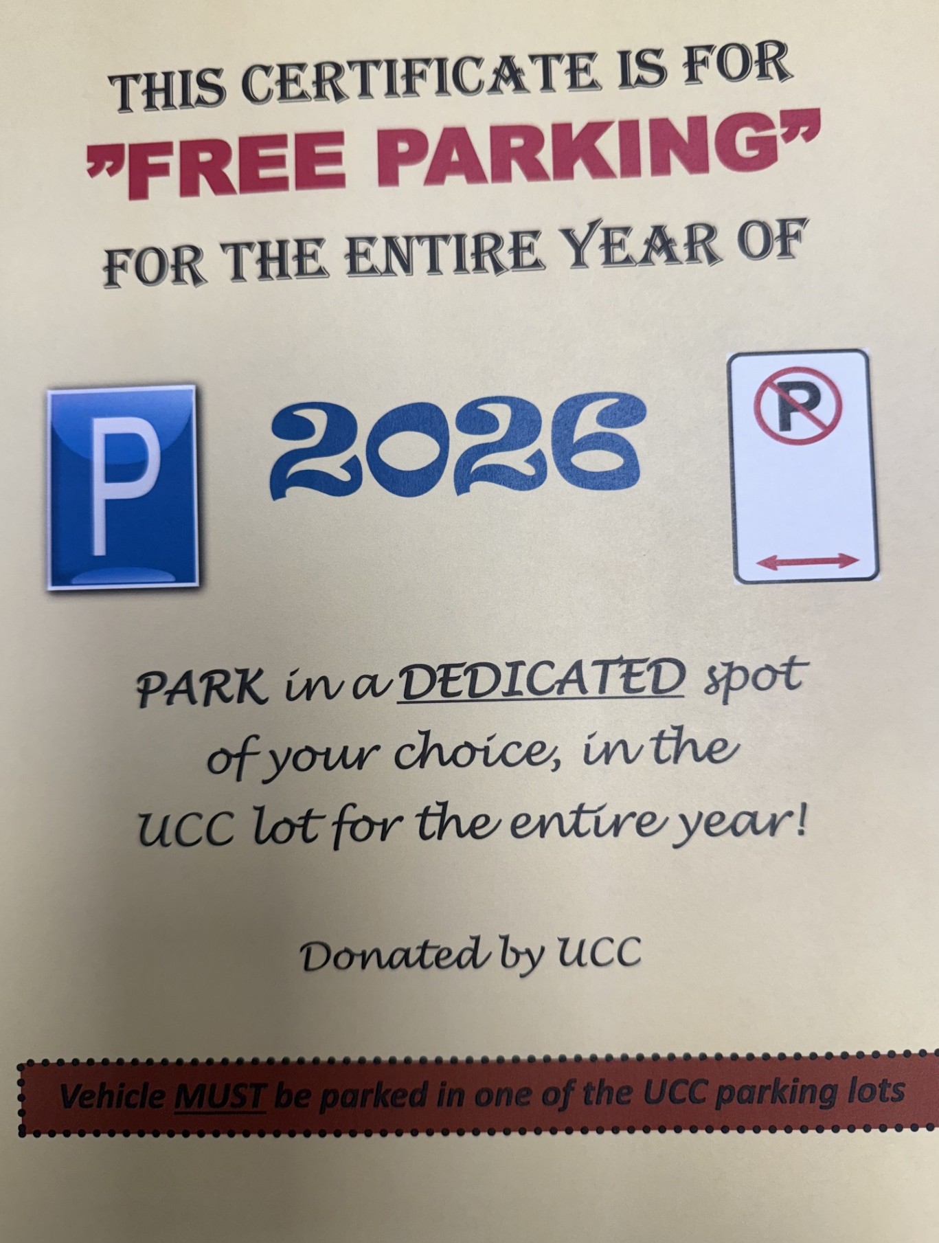 This certificate is for FREE PARKING for the entire year 2026 in any of the UCC parking lots.
