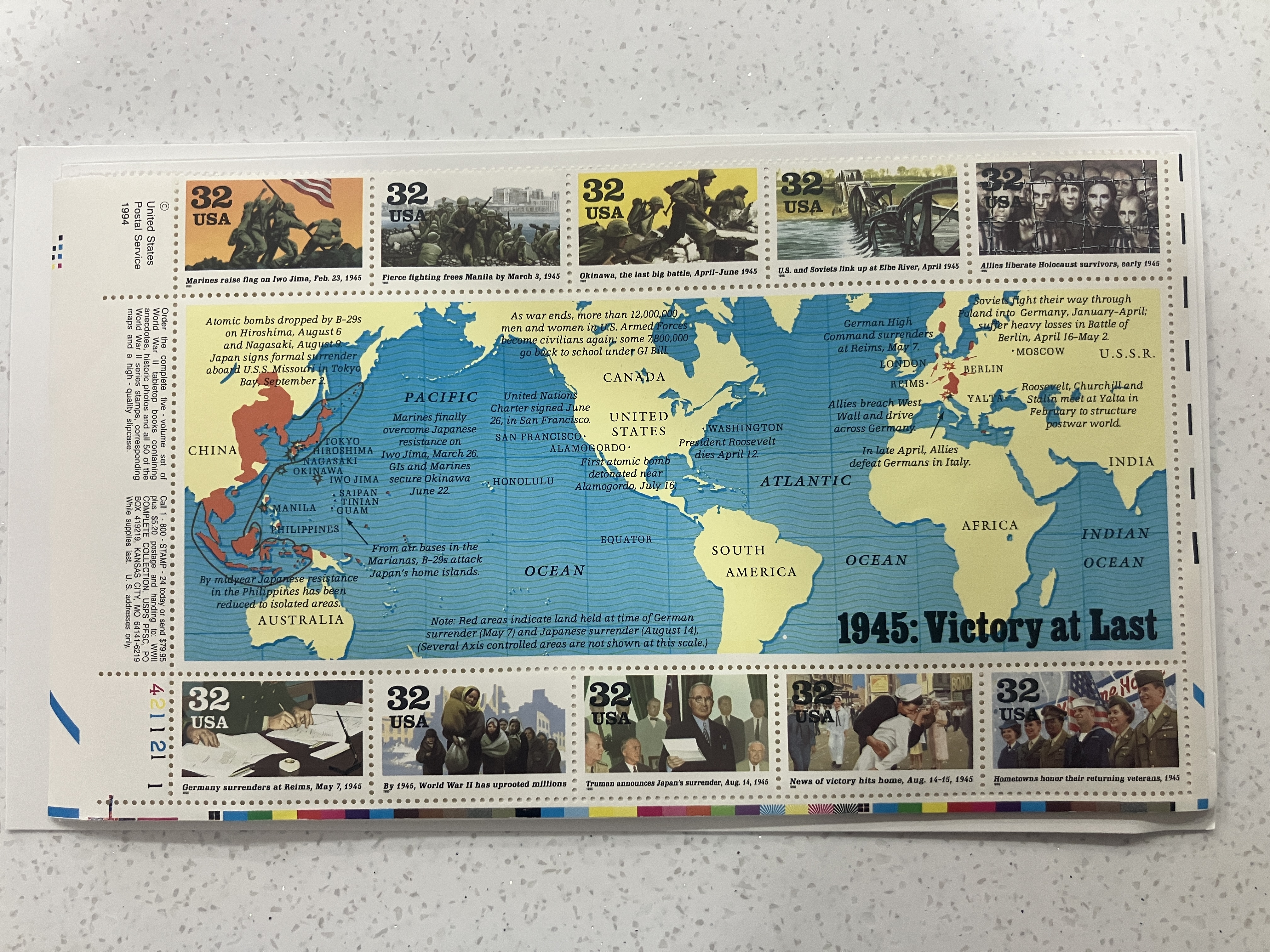 This is a half sheet of collector stamps that celebrates the end of WW2.