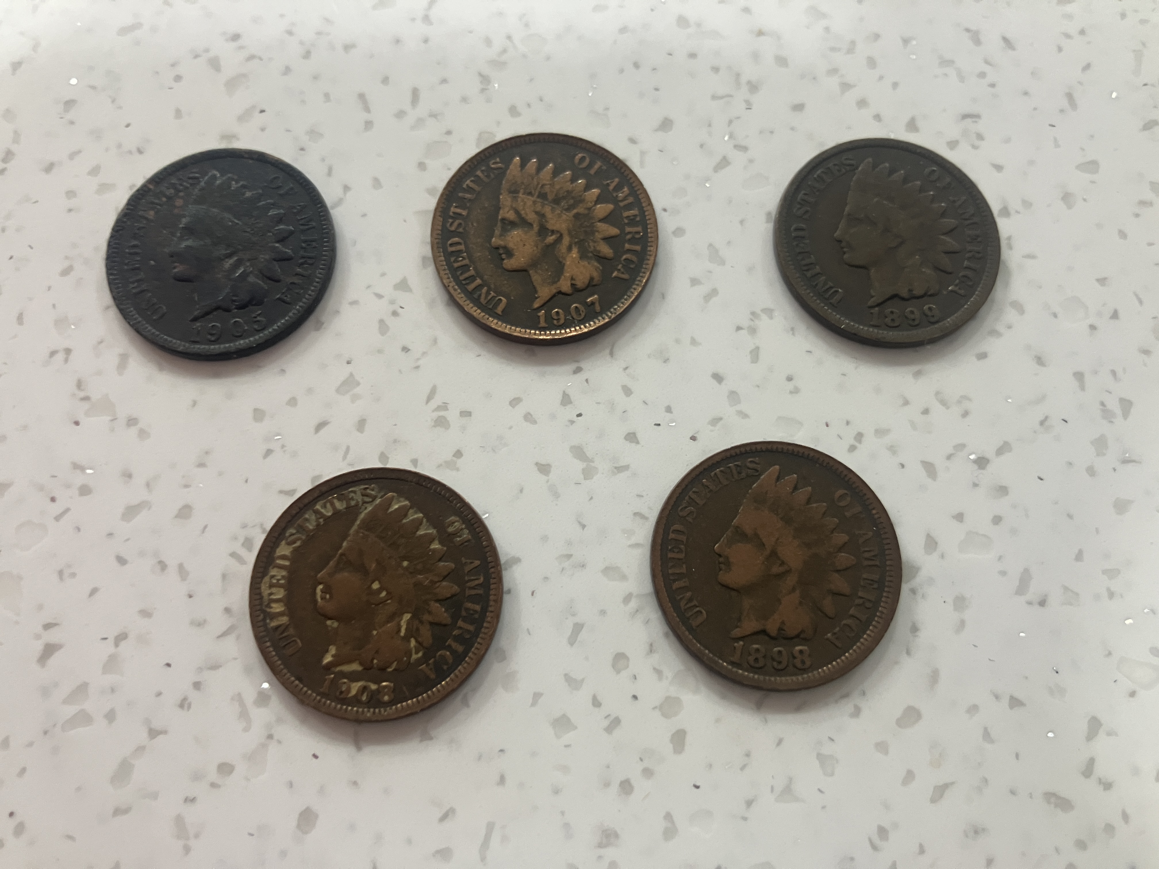 5 Indian Cents from: 1905,1908,1907, 1898, 1899