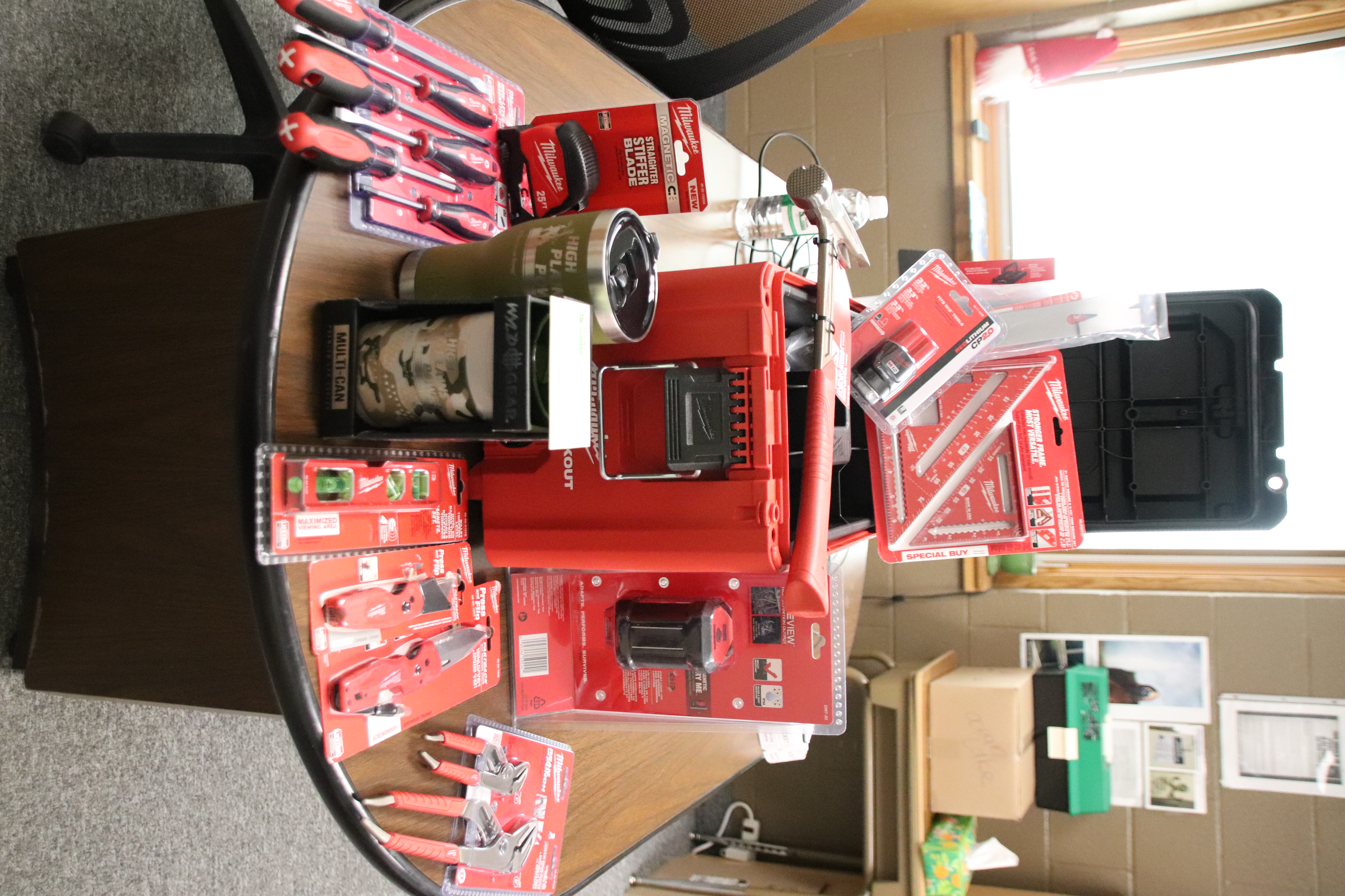 This set includes 700 lumens light, 22 oz framing hammer, speed square set, magnetic level, cp 2.0 lithium battery, ream and punch plyers, utility knife, 25ft meassuring tape, 5-in-1 folding knife, screw driver set (6 pcs), pribar, stainless steel coffee cup with bottle opener on the bottom, premium can cooler, and milwaukee packout tool box.