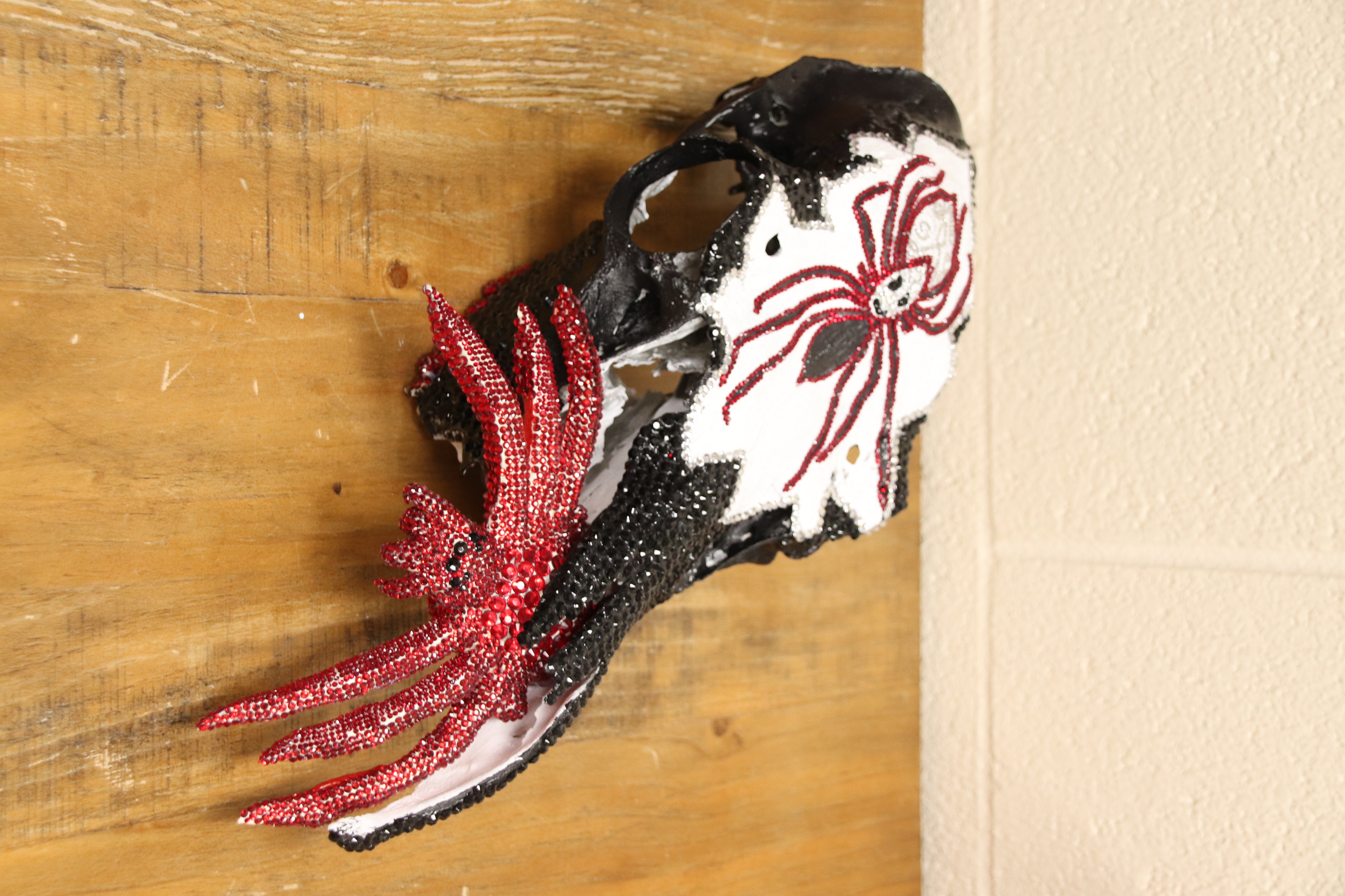 Cow skull decorated in rinestones and acryclic paint with a clay spider.