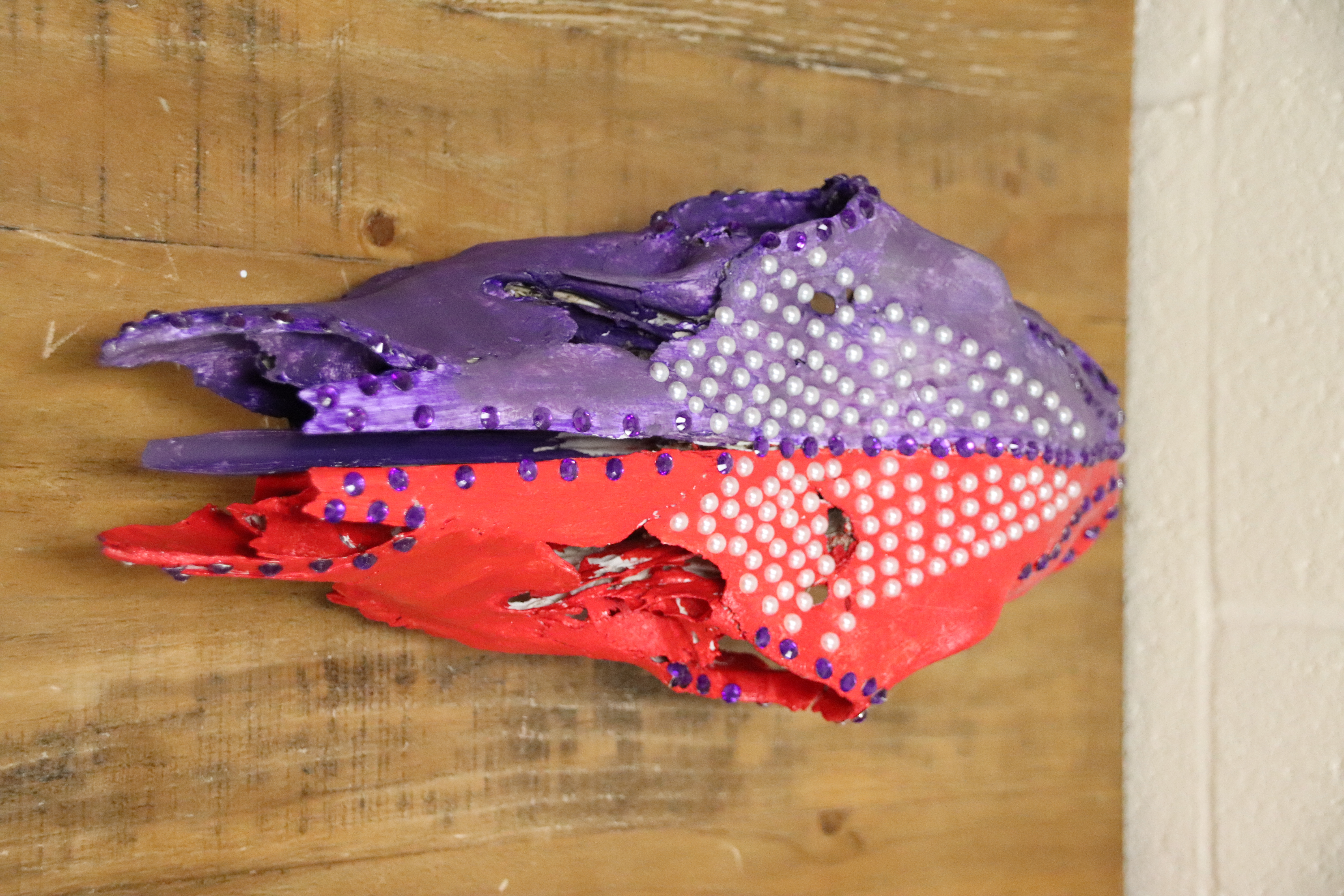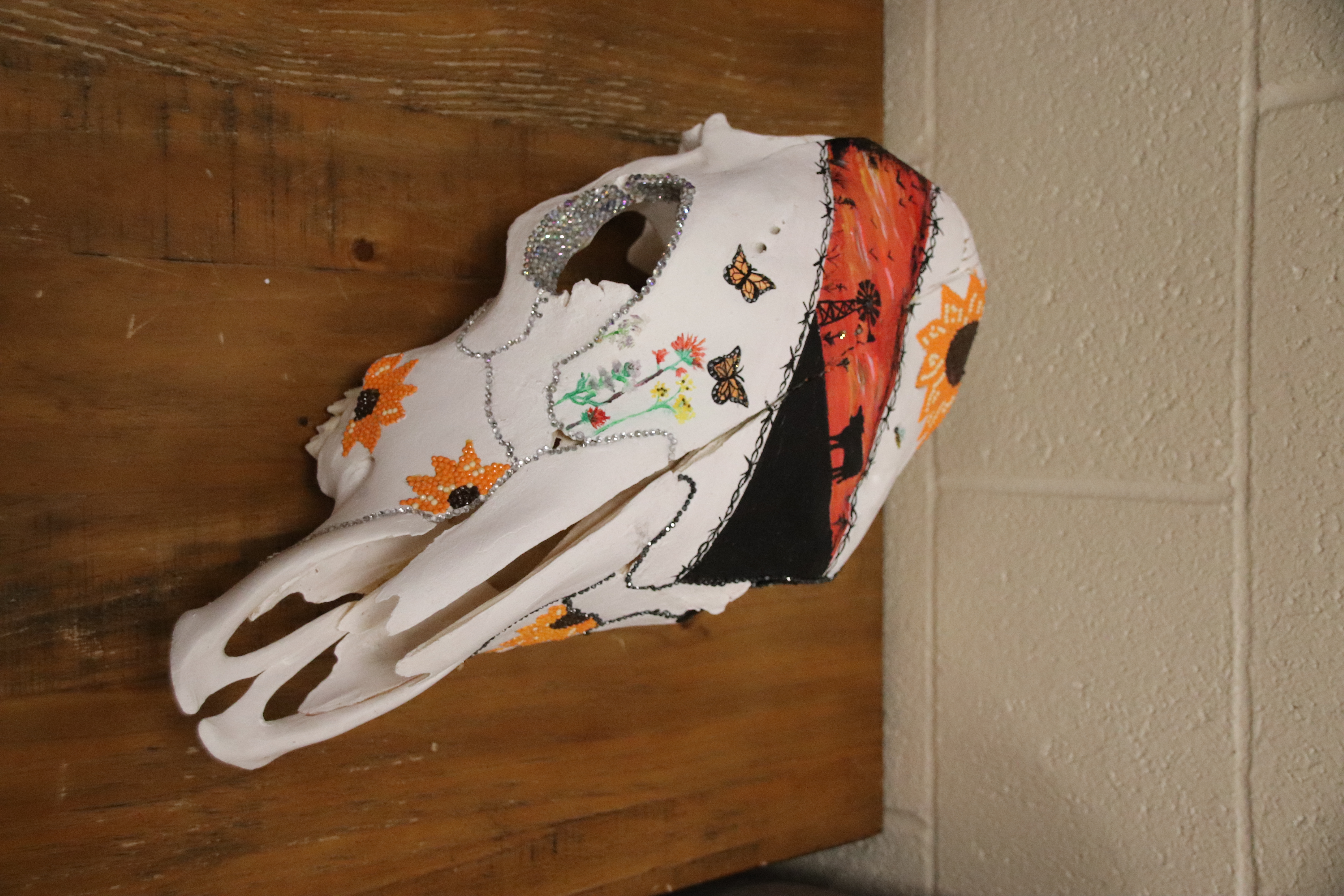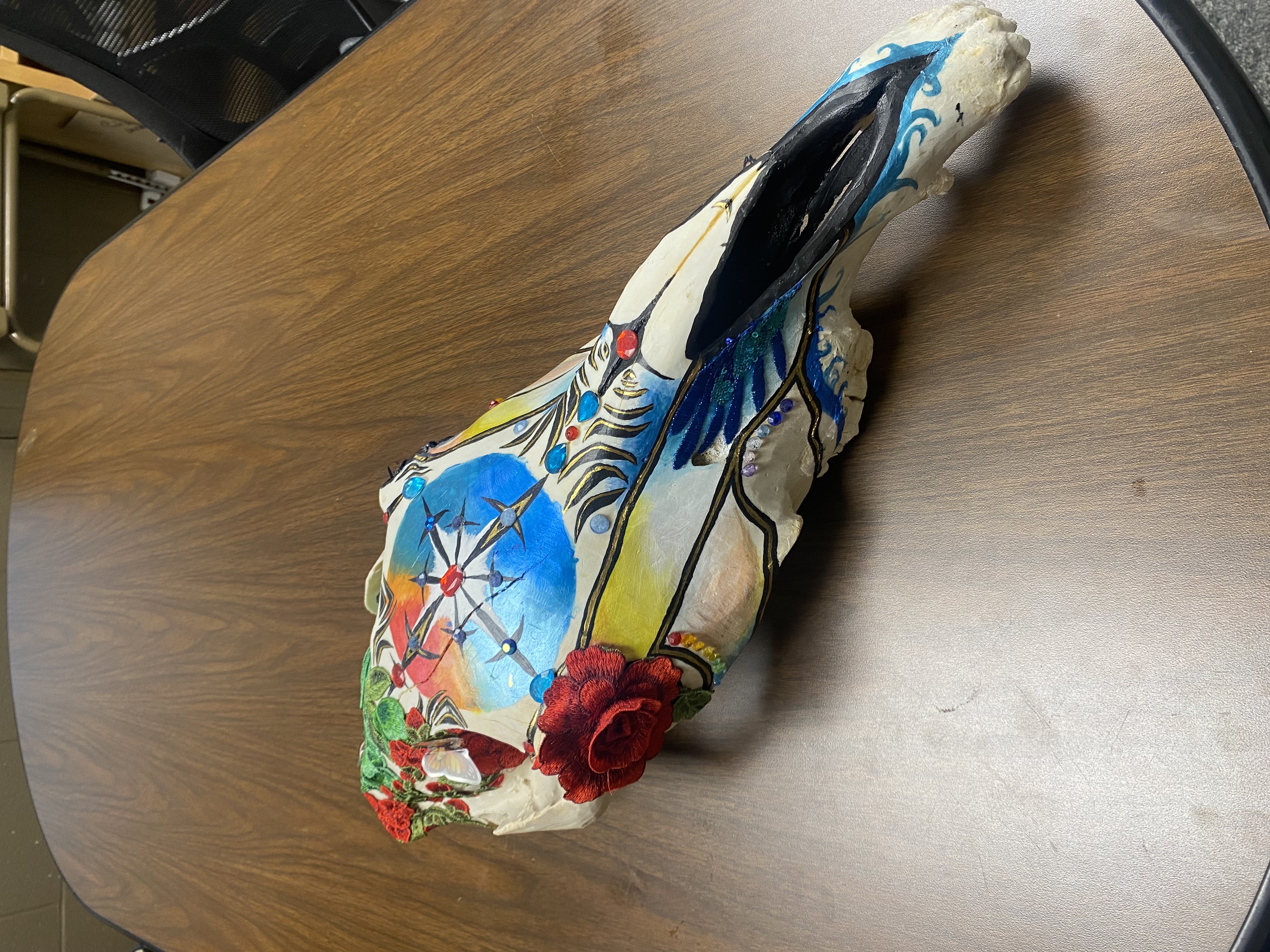 Horse Skull decorated with flower patches, rinestones, and acrylic paint.
