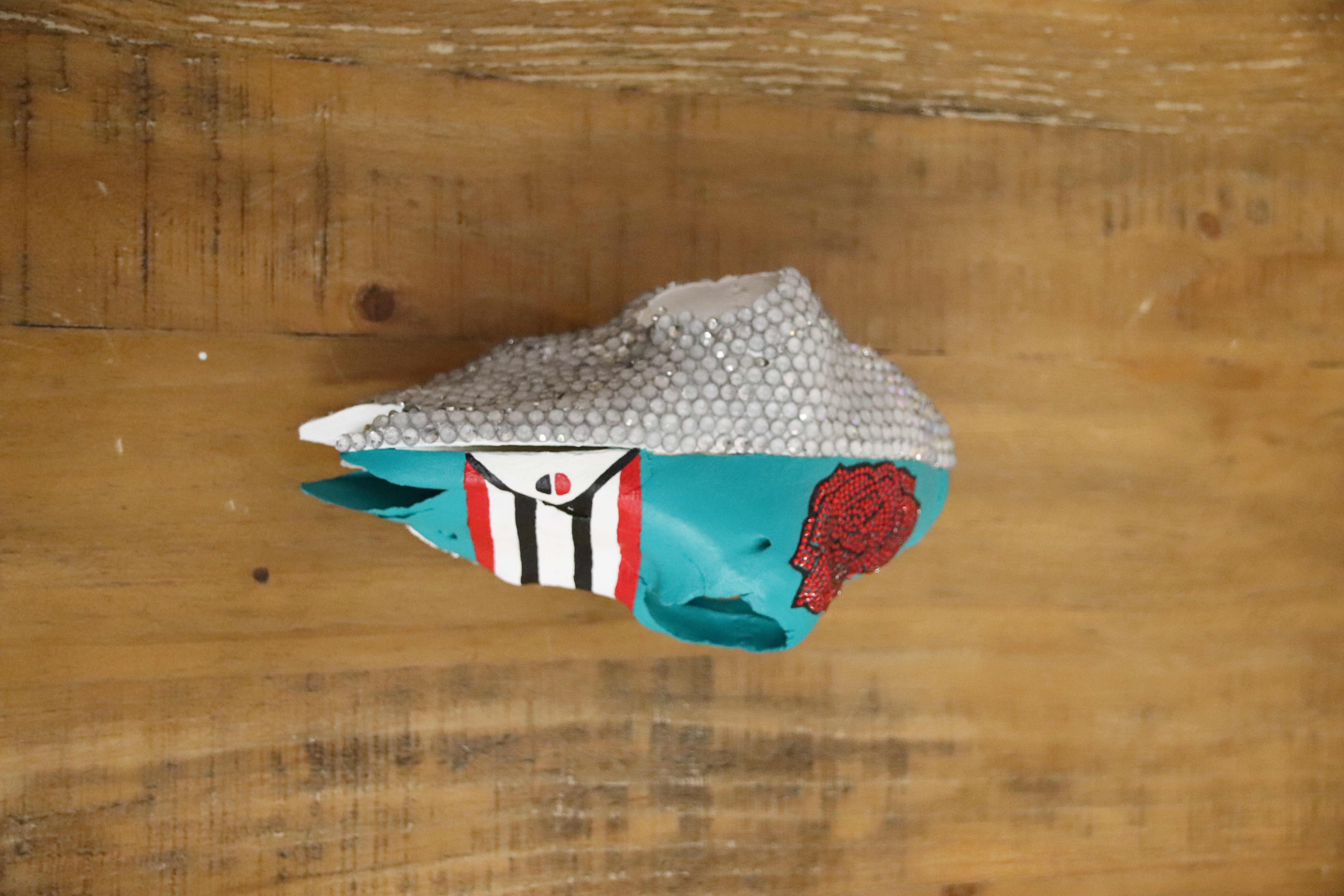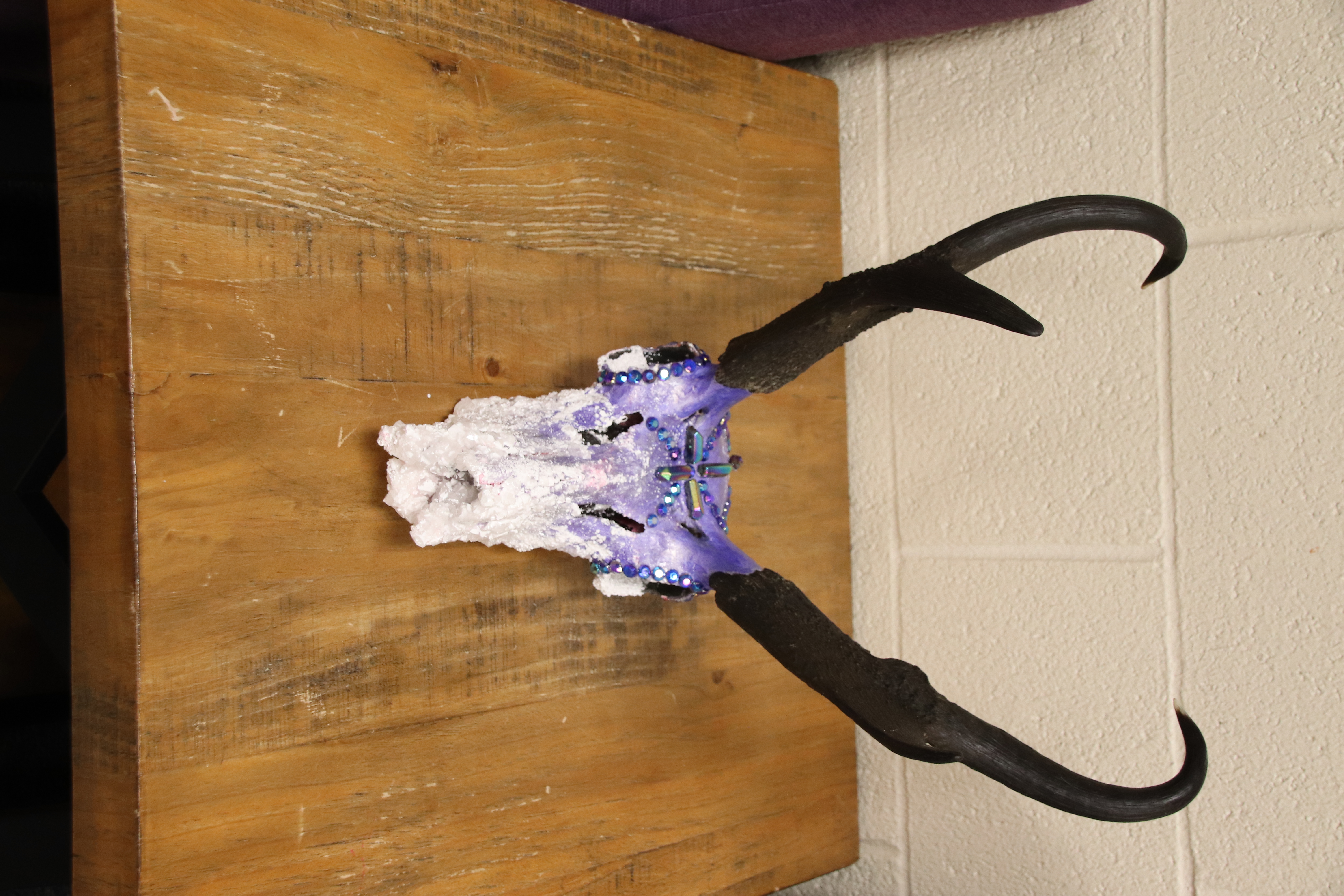 Antelope Skull decorated in rinestones, acrylic paint, and sugar crystals.