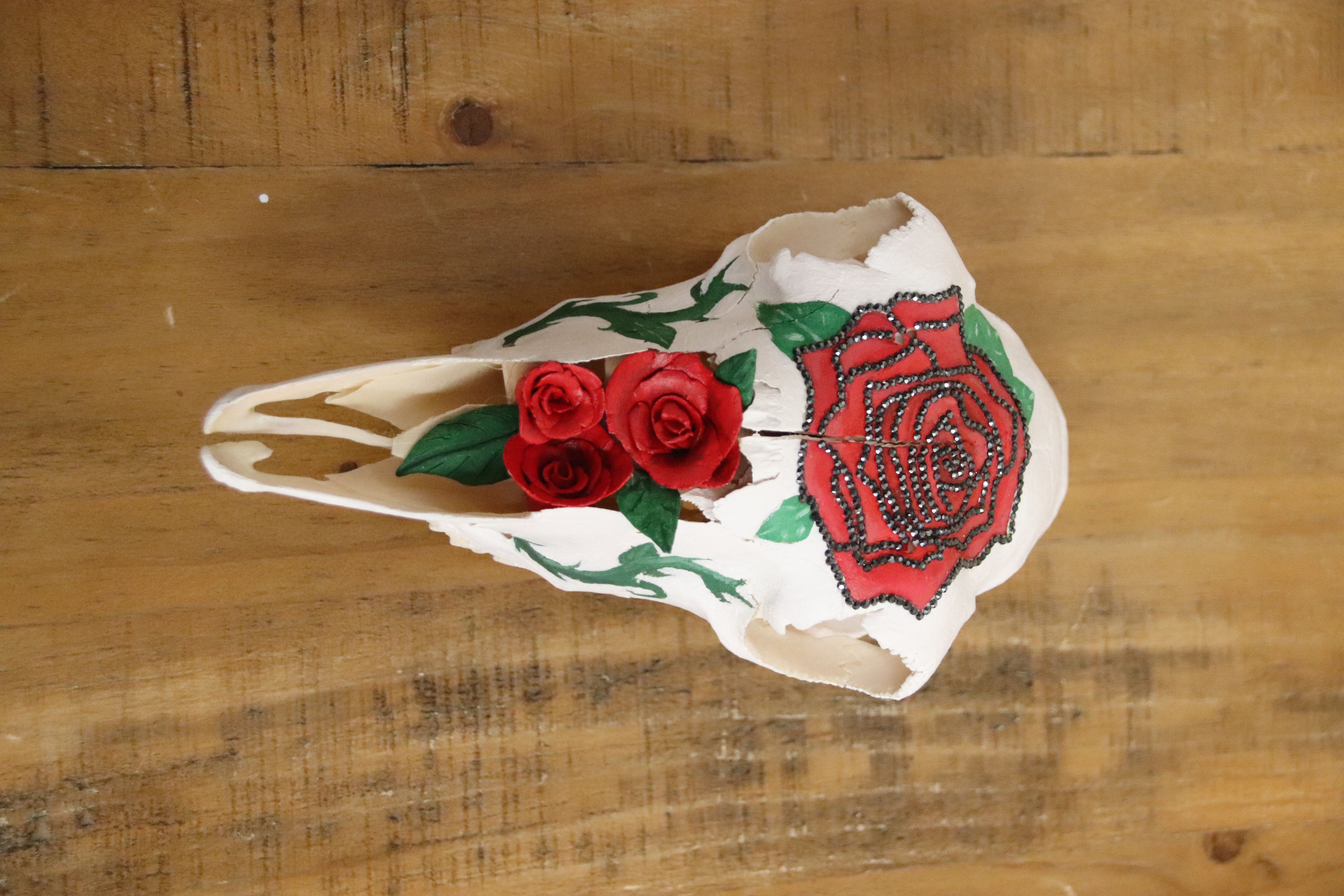 Cow Skull decorated with rinestones and acryclic paint.