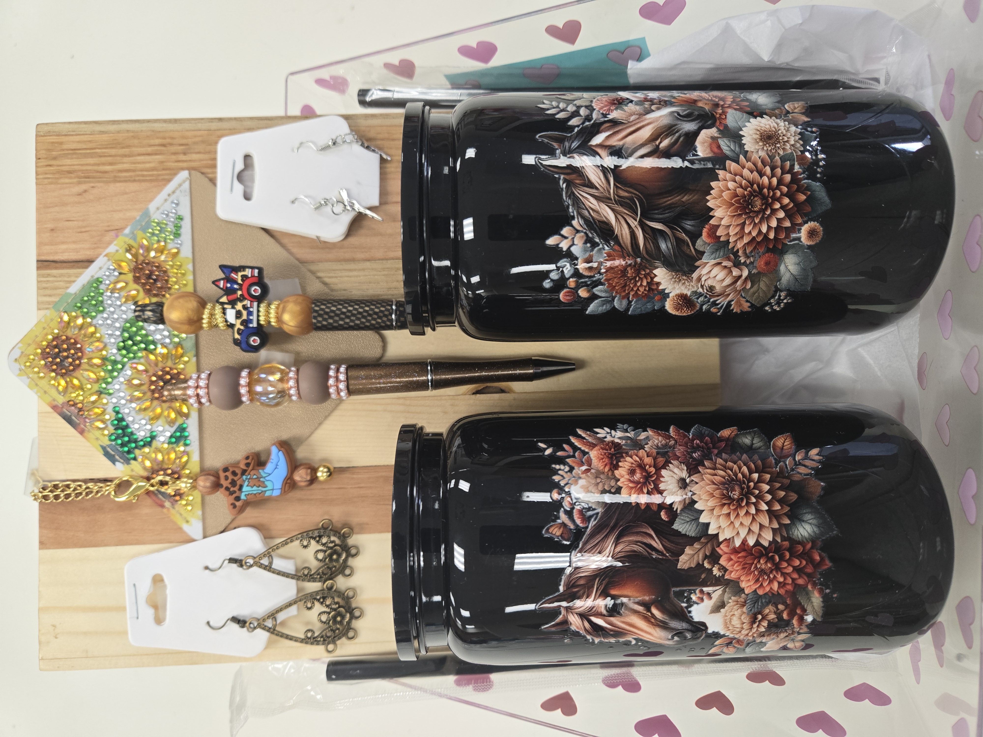2 Plastic cups with straws, 1 cutting board, 2 pens, 2 pairs of earrings, 1 keychain, 1 leather bookmark.