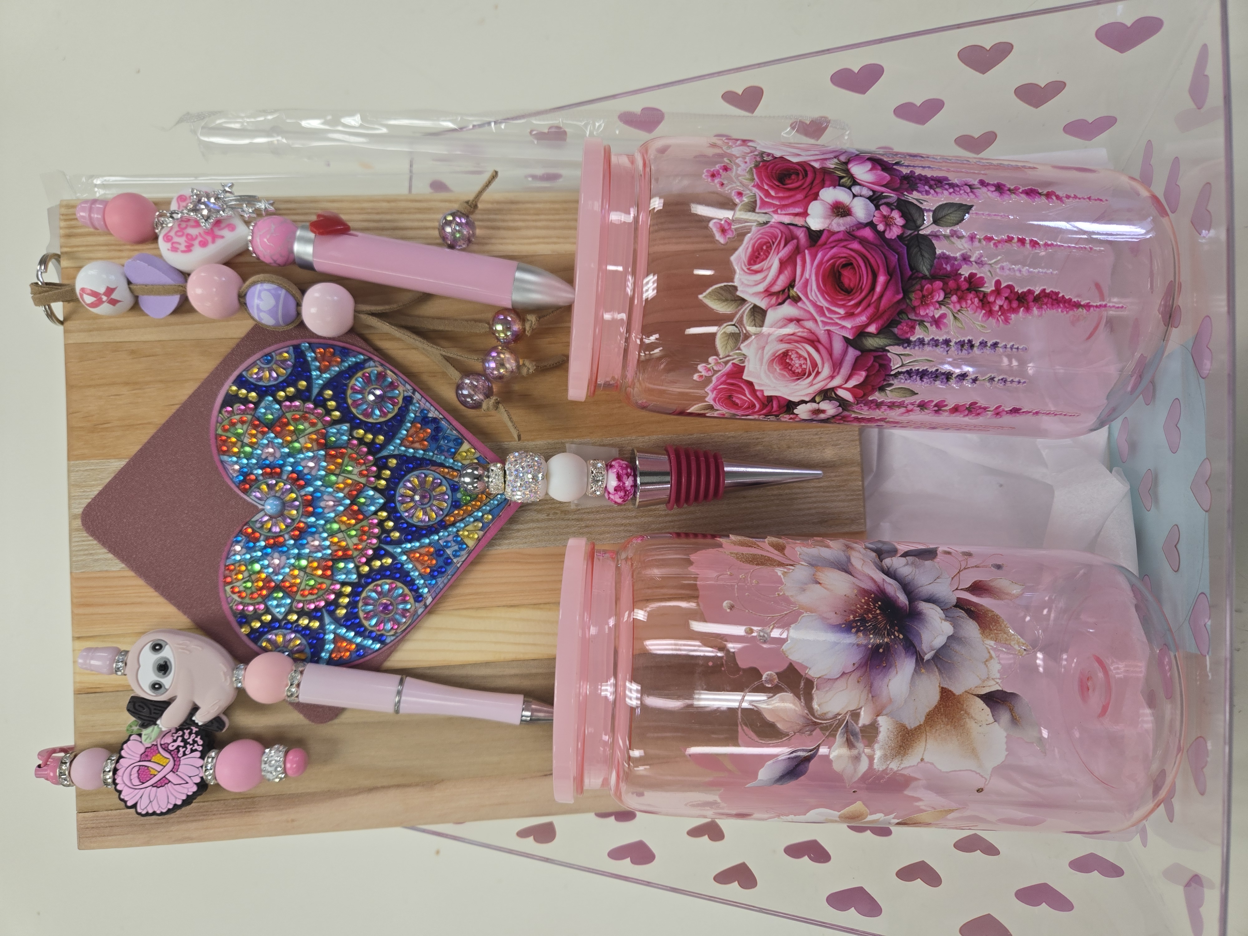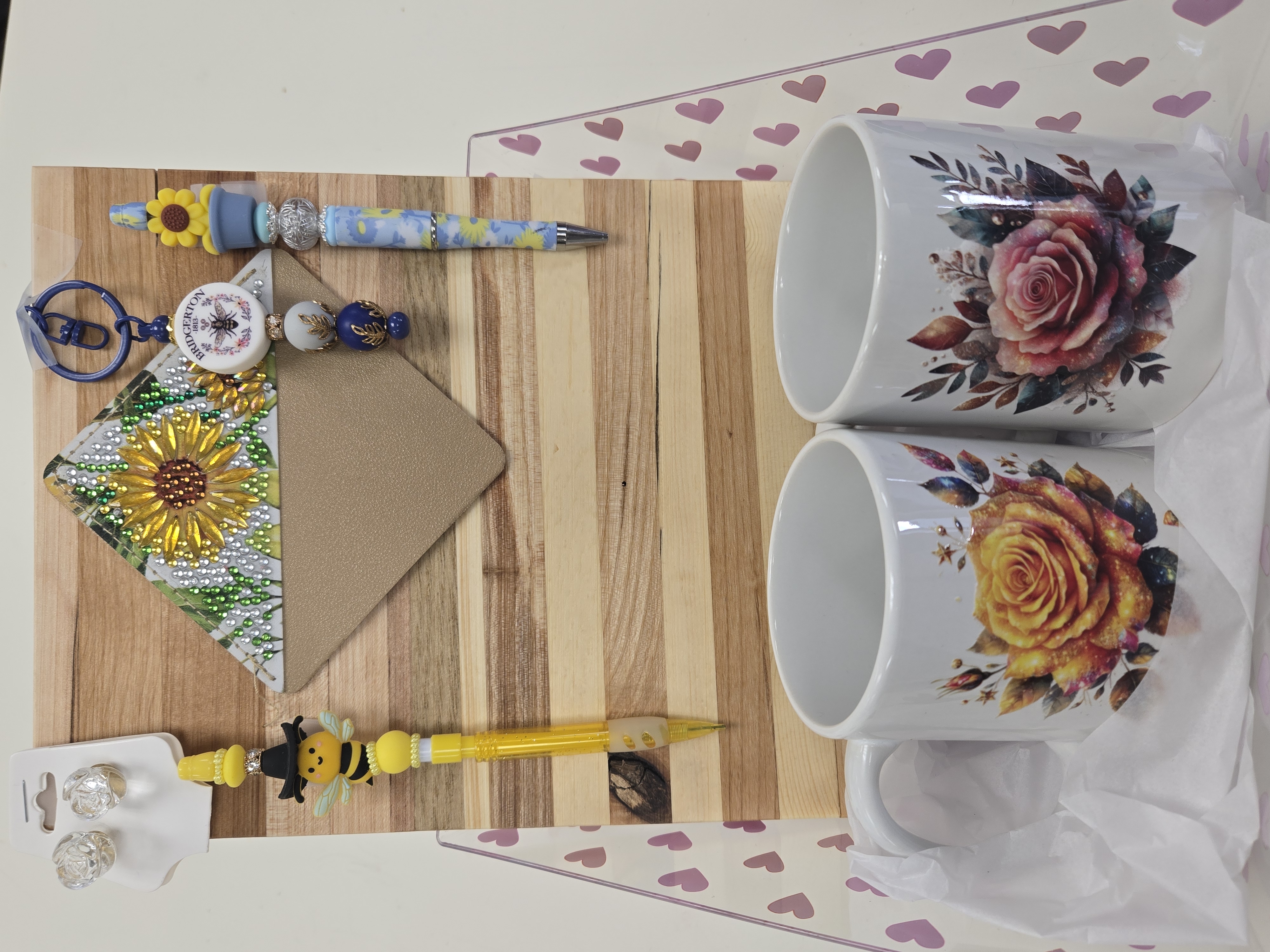 2 coffee cups, 1 cutting board, 1 mechanical pencil, 1 pen, 1 pair of rose earrings, 1 leather bookmark, 1 Bridgerton themed keychain.