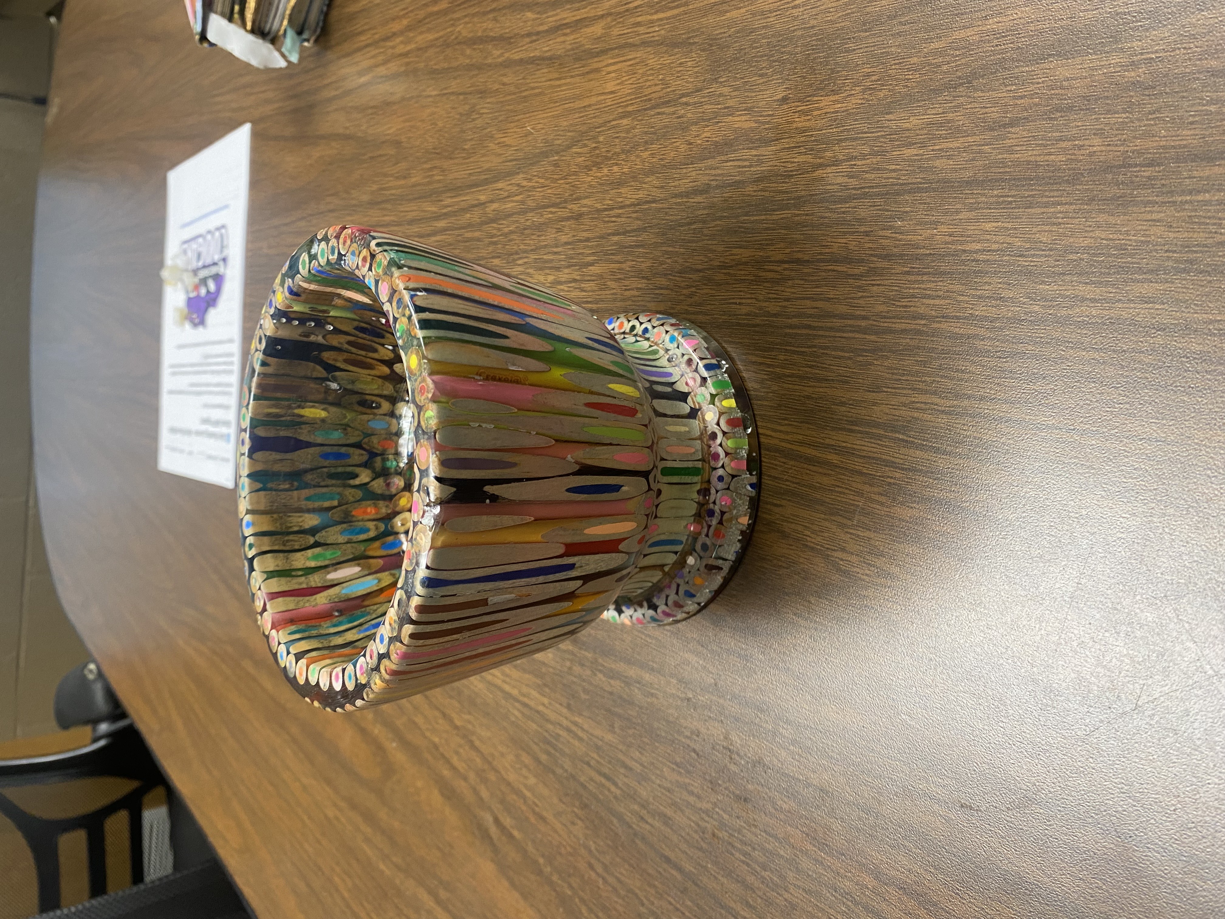 This desk caddy/ bowl is home made from colored pencils and epoxy. You can use it to hold whatever knickknacks you need.