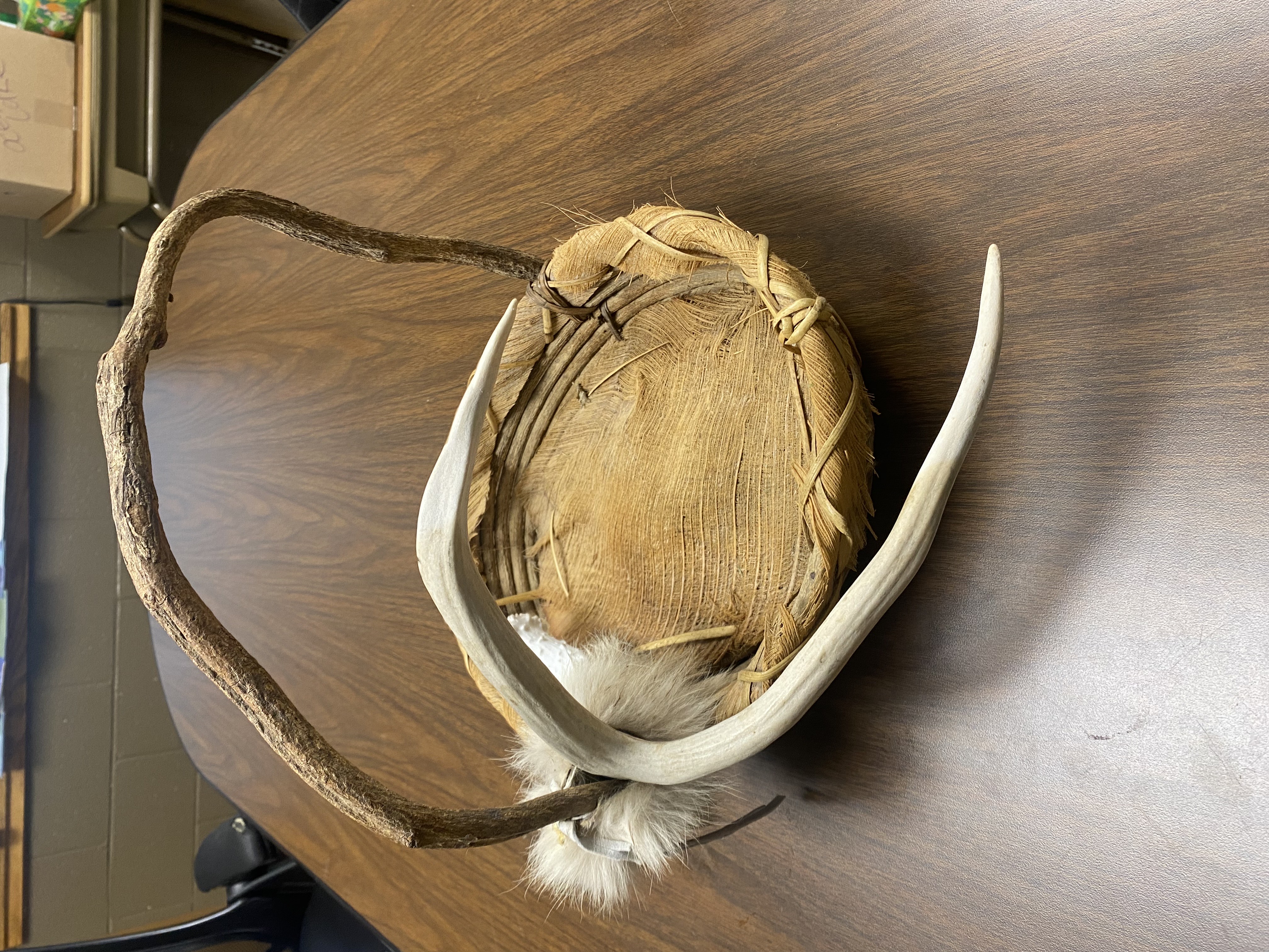 Handmade basket made from wood, burlap, and a deer antler.