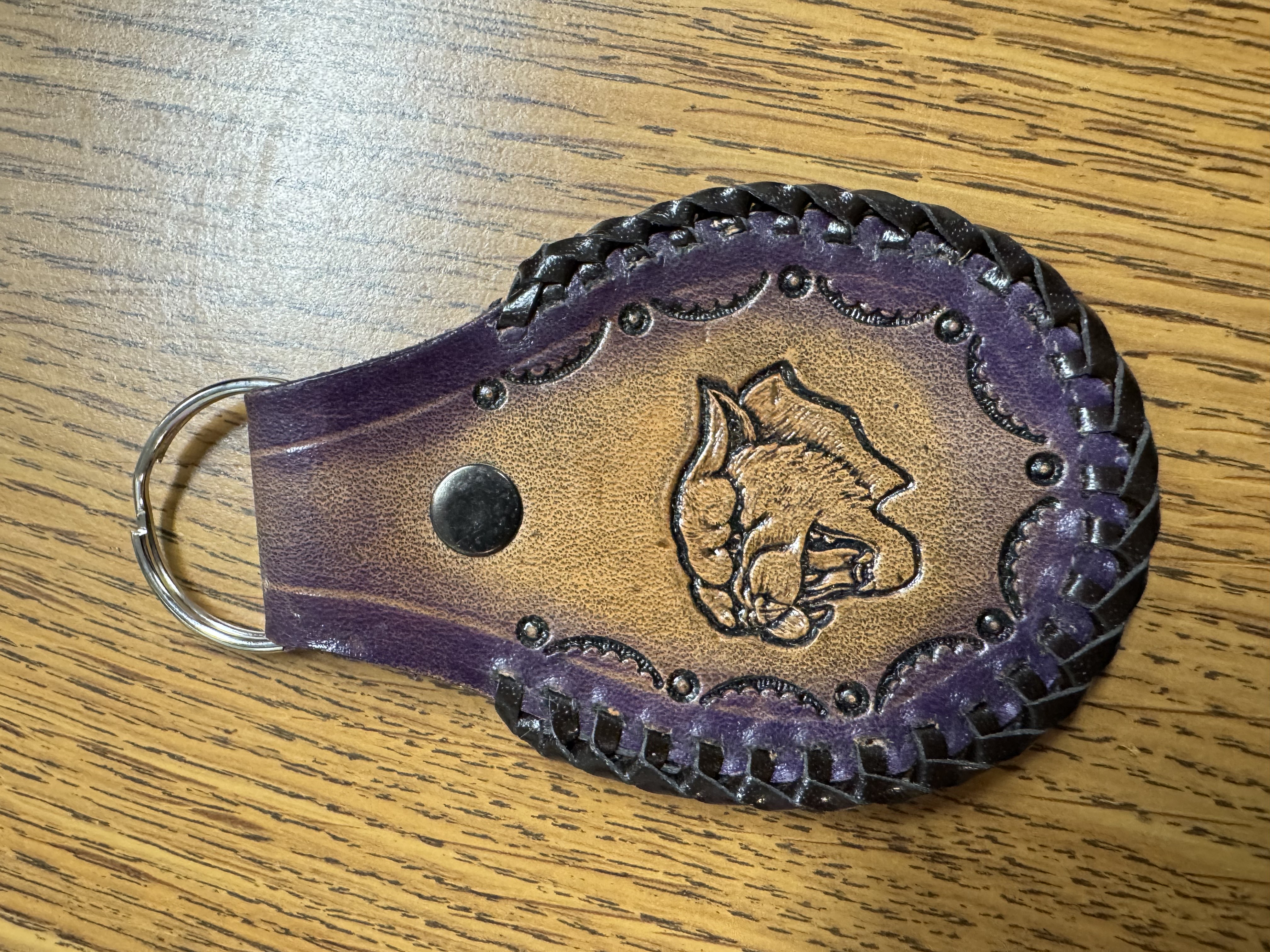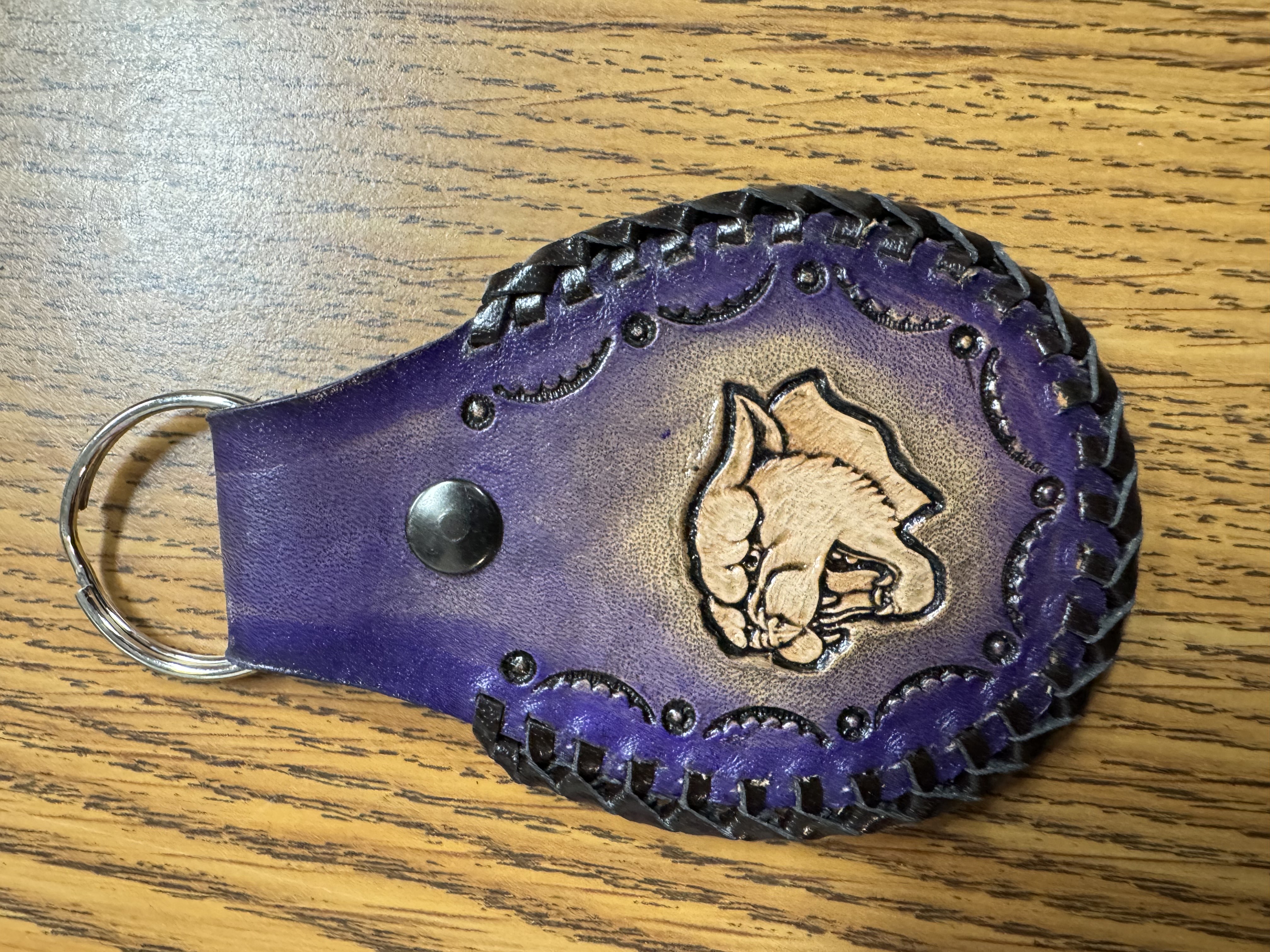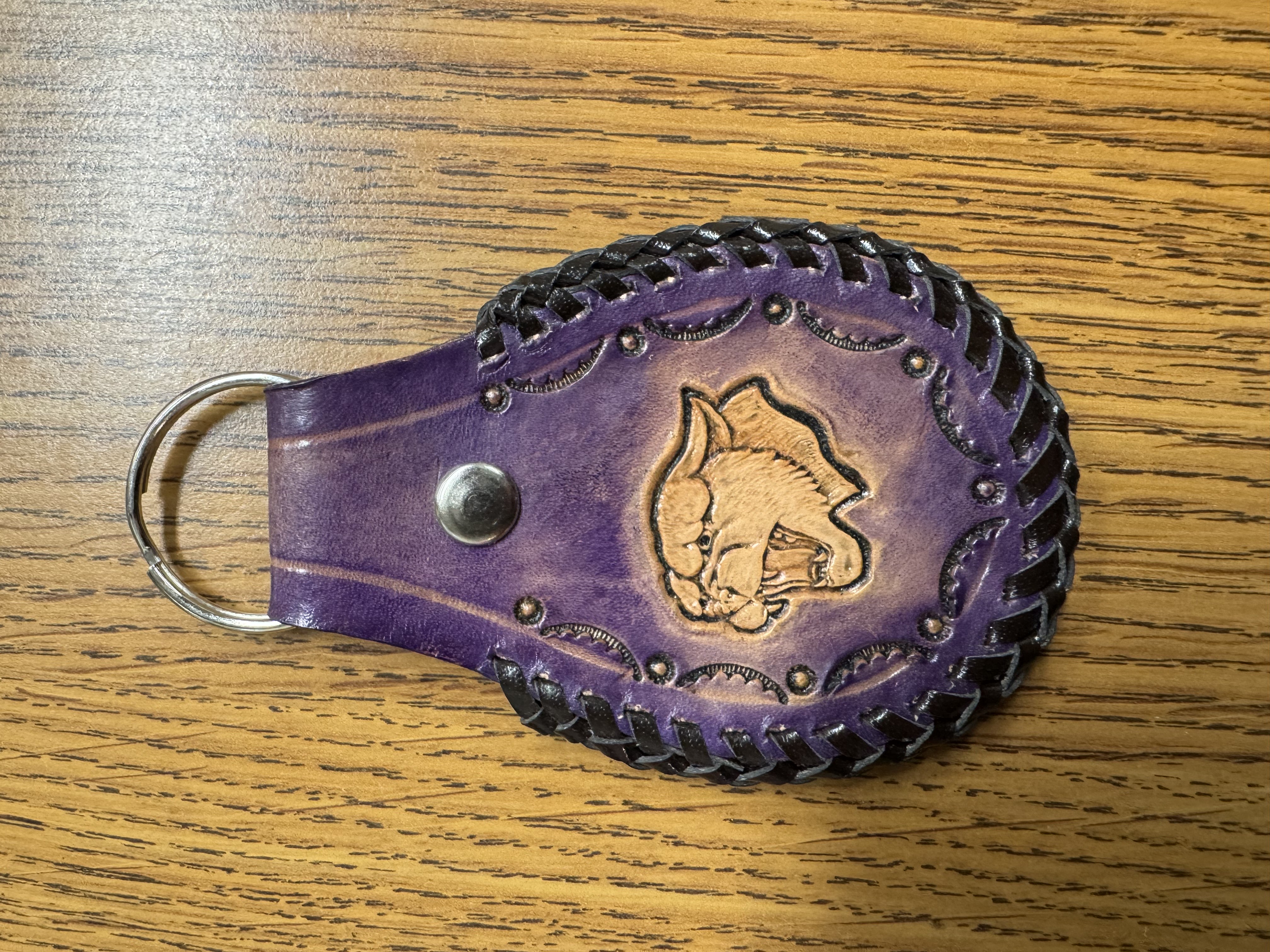 Purple cougar leather key chain made by Roger Leonhardt.