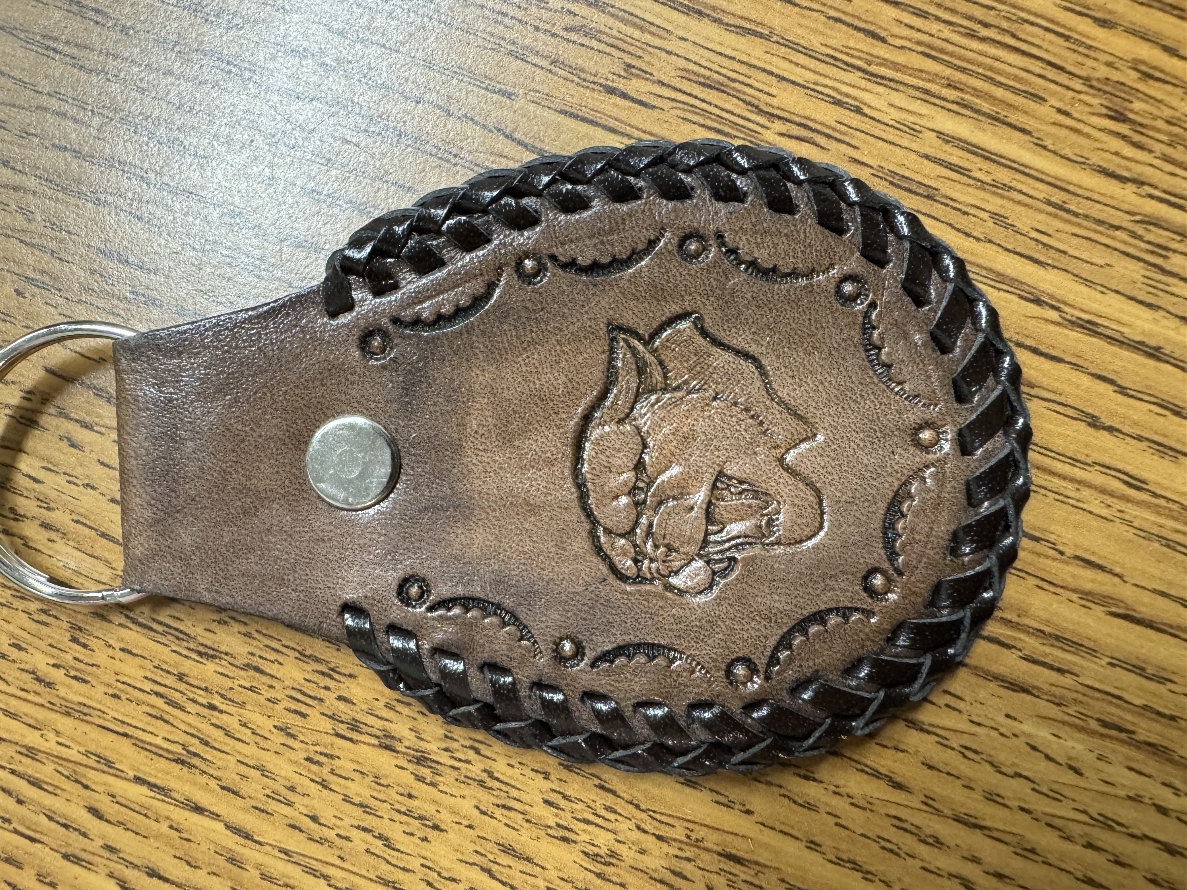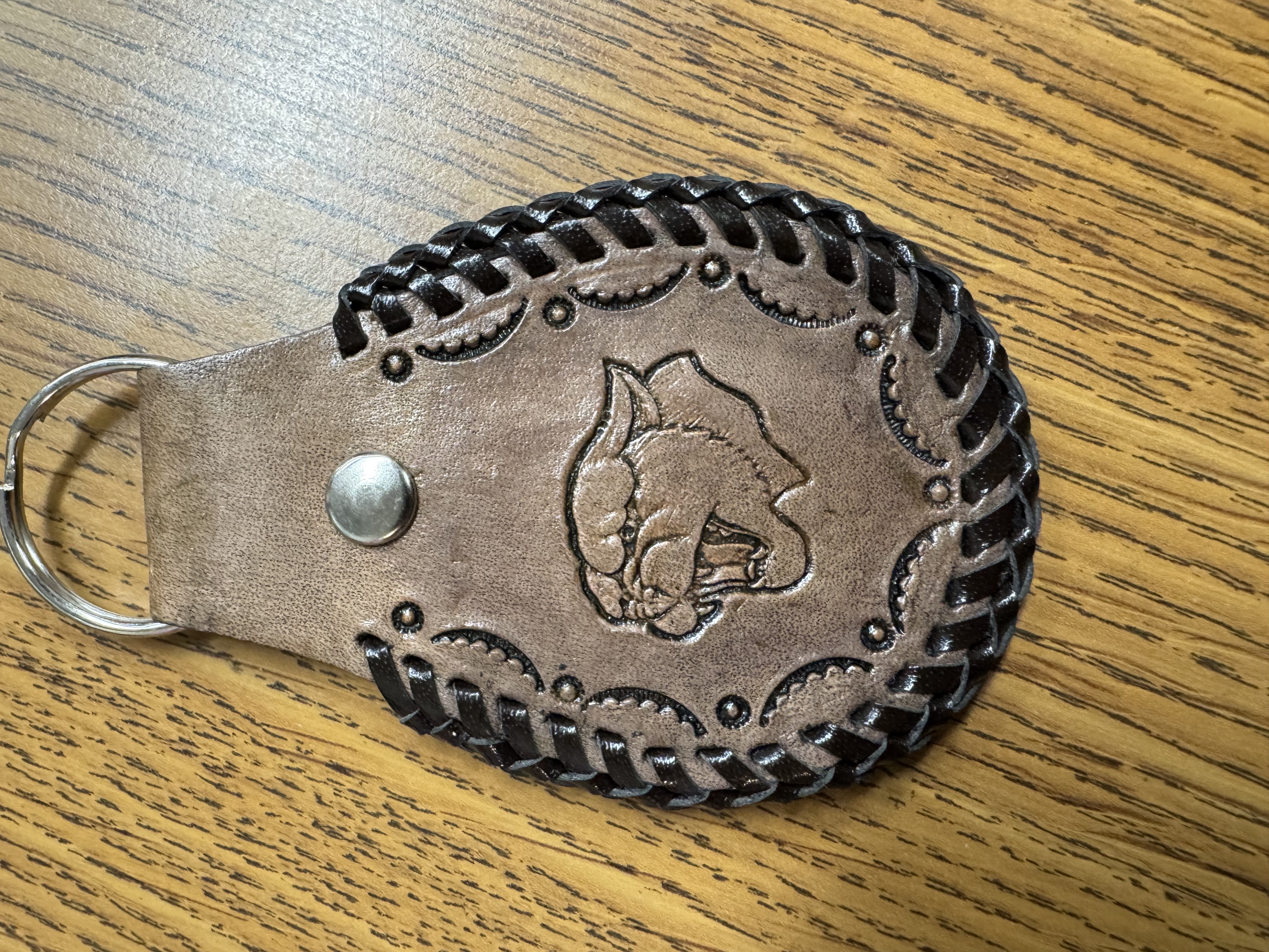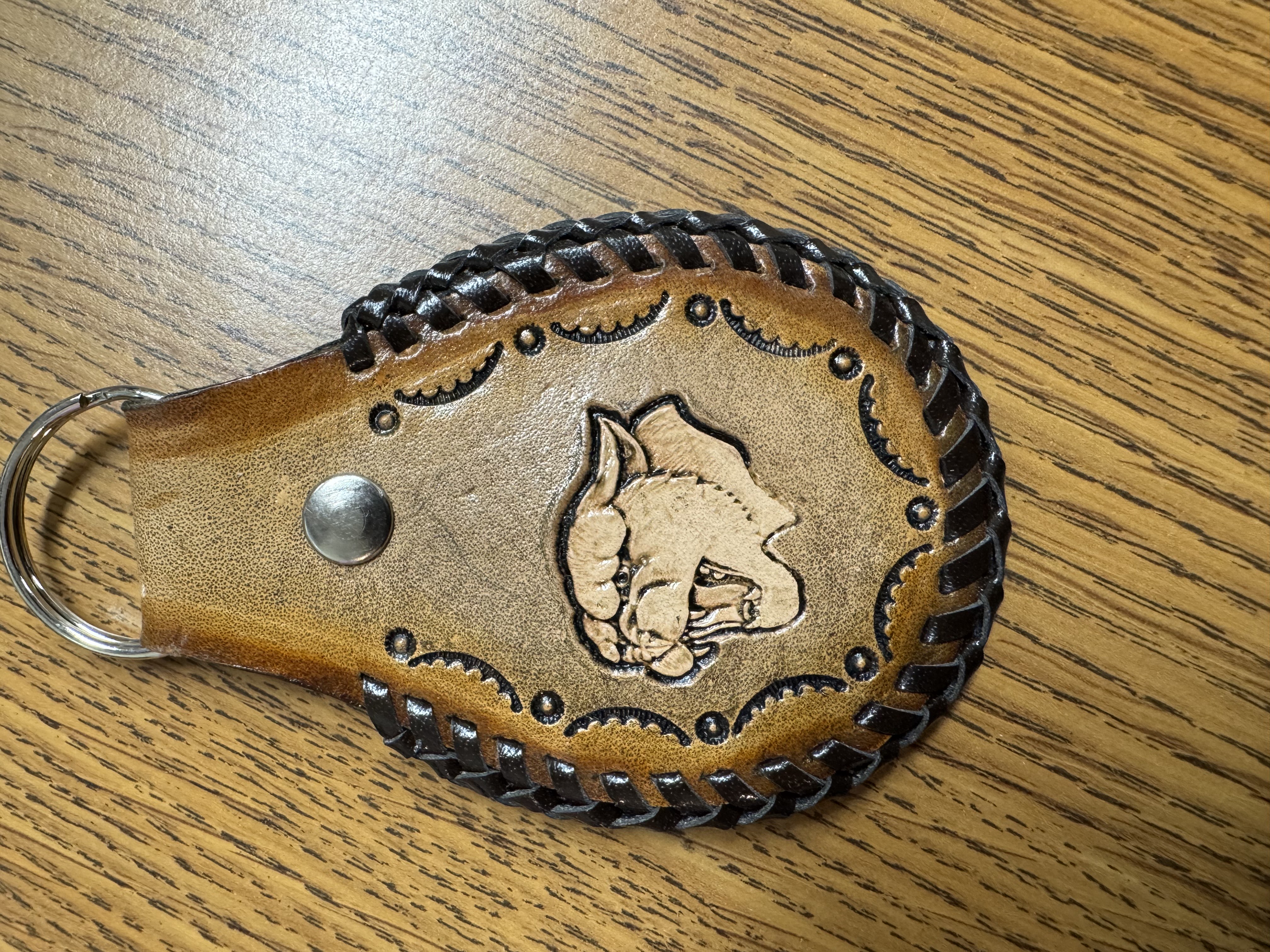Lighter brown leather cougar key chain made by Roger Leonhardt.