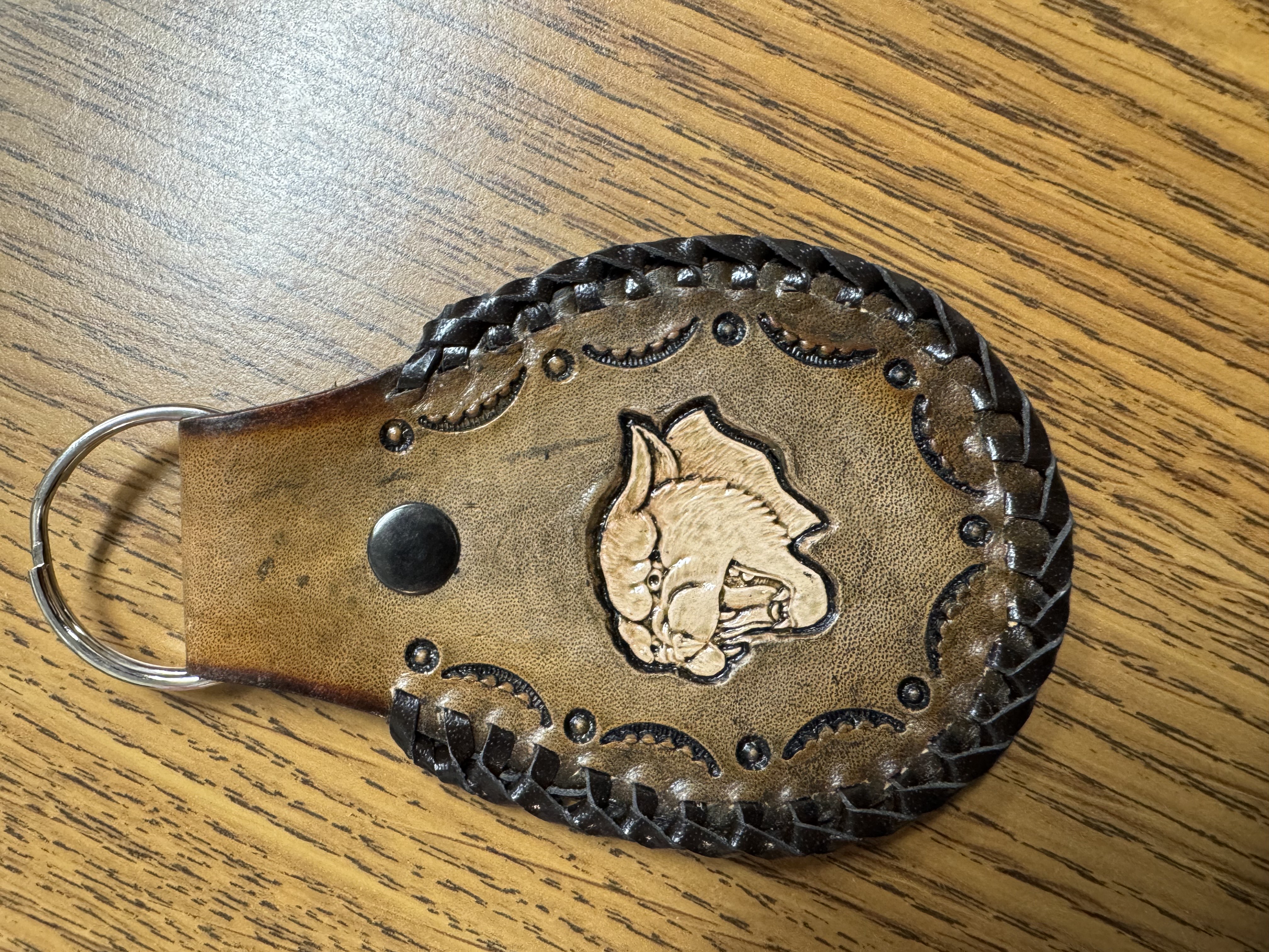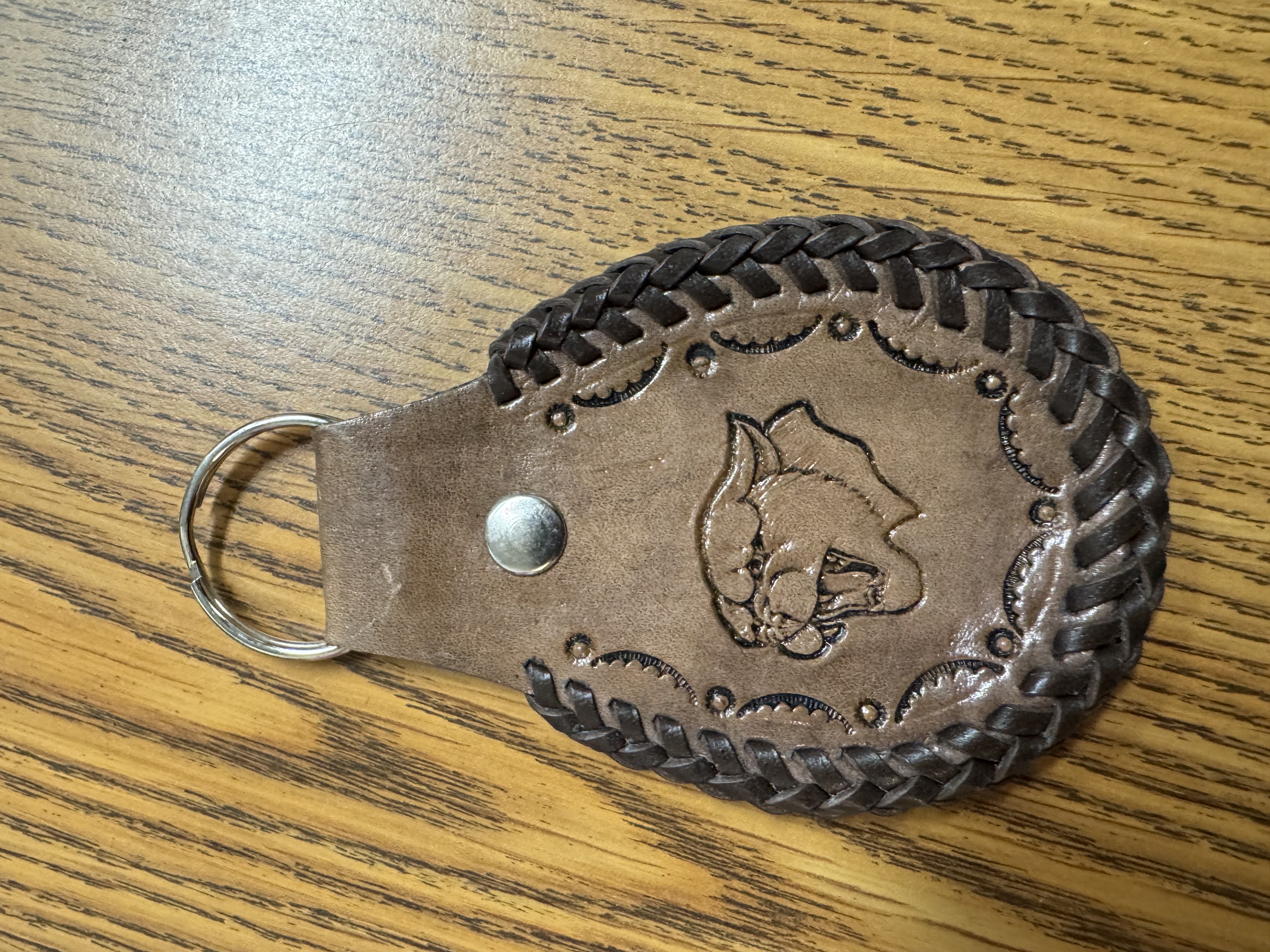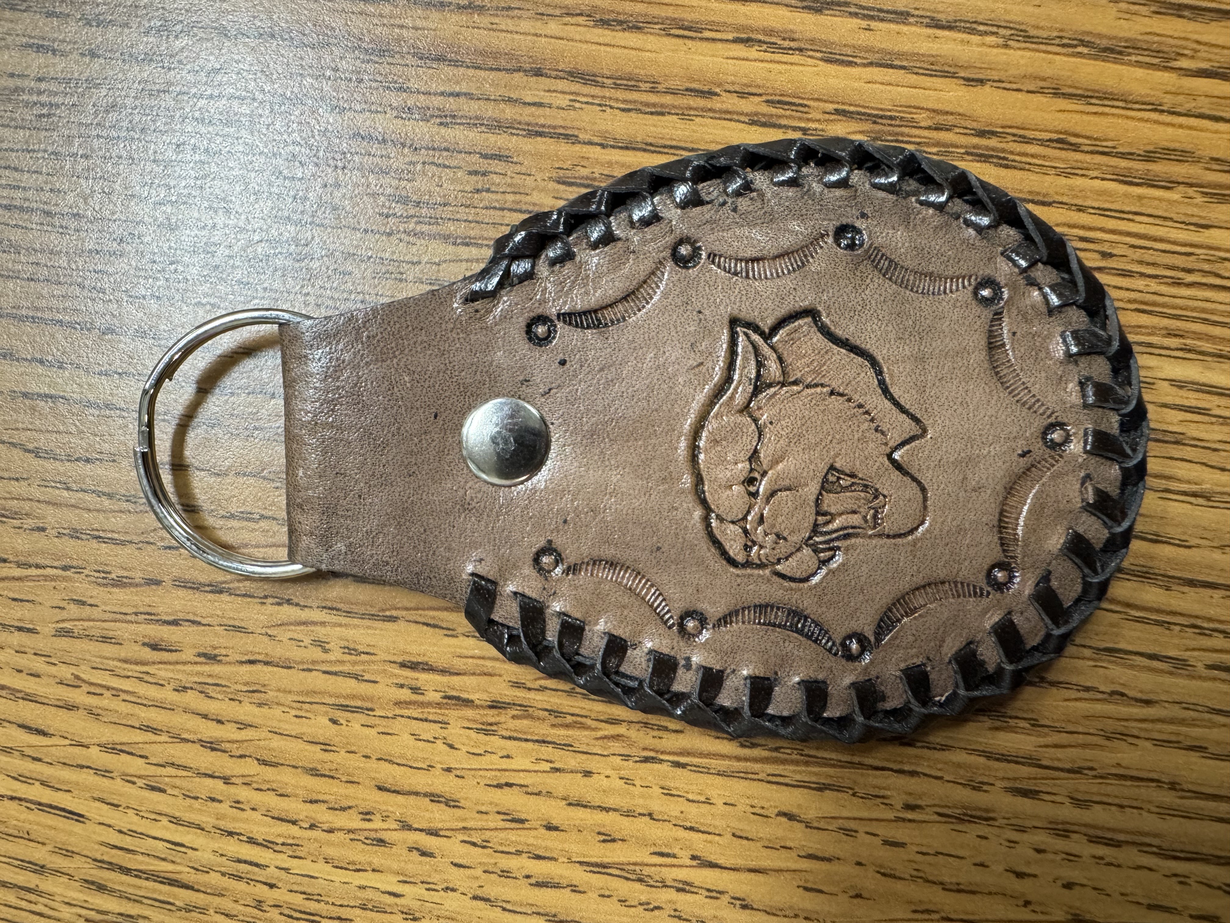 Lighter brown leather cougar key chain made by Roger Leonhardt.