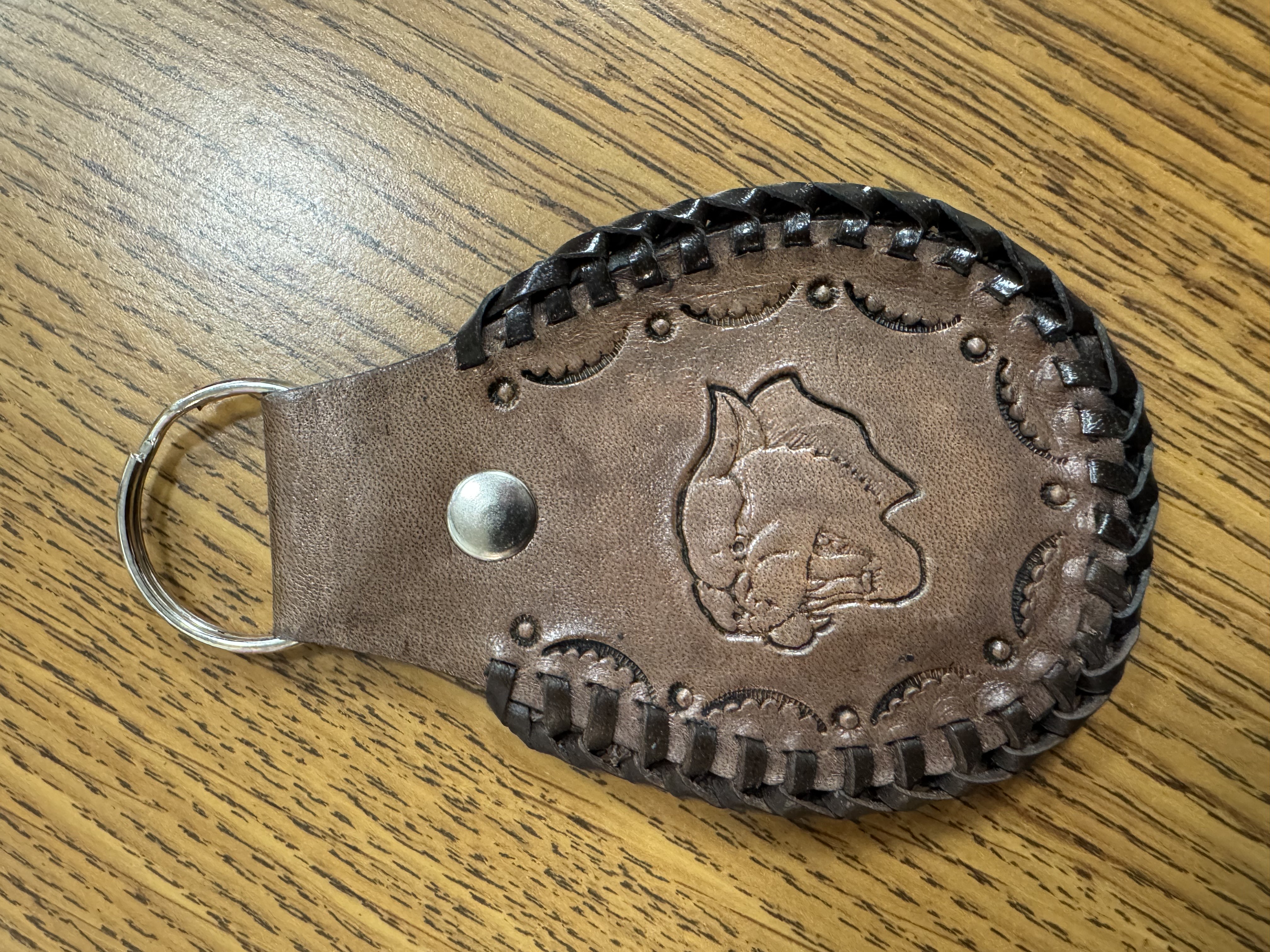 Dark brown leather cougar key chain made by Roger Leonhardt..