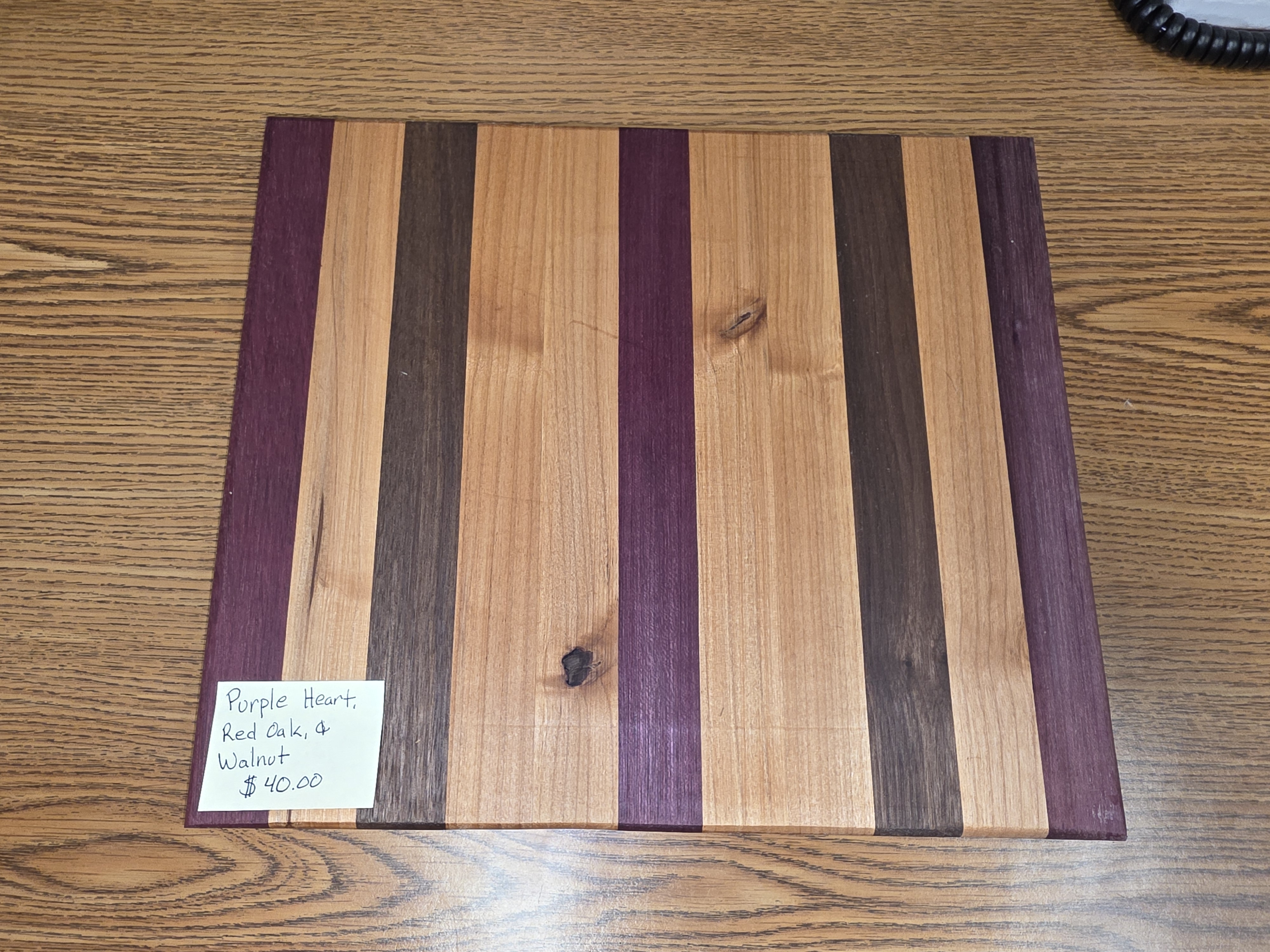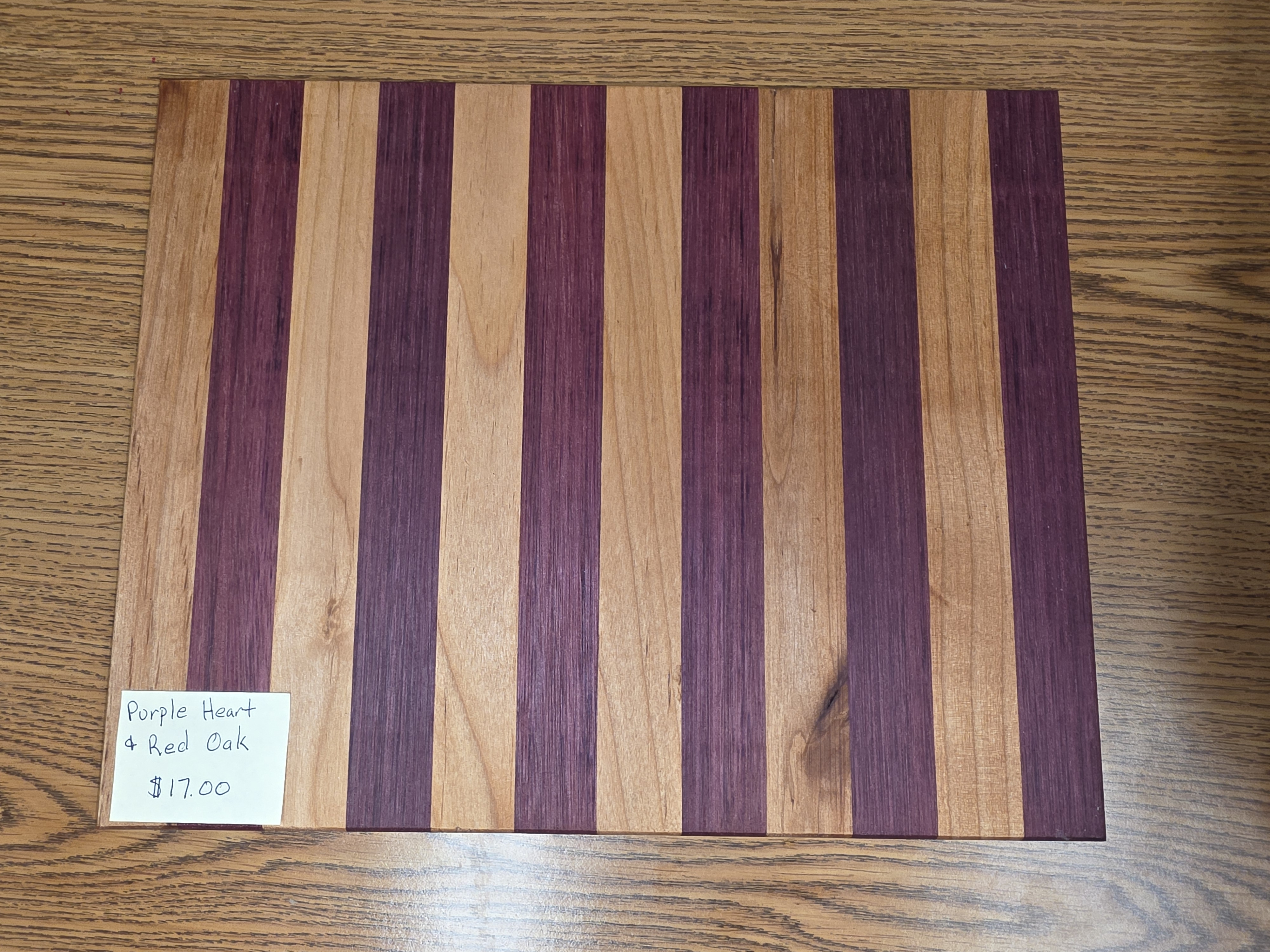 Cutting board made from purple heart and red oak. Made by the students in woods class here at Wind River.