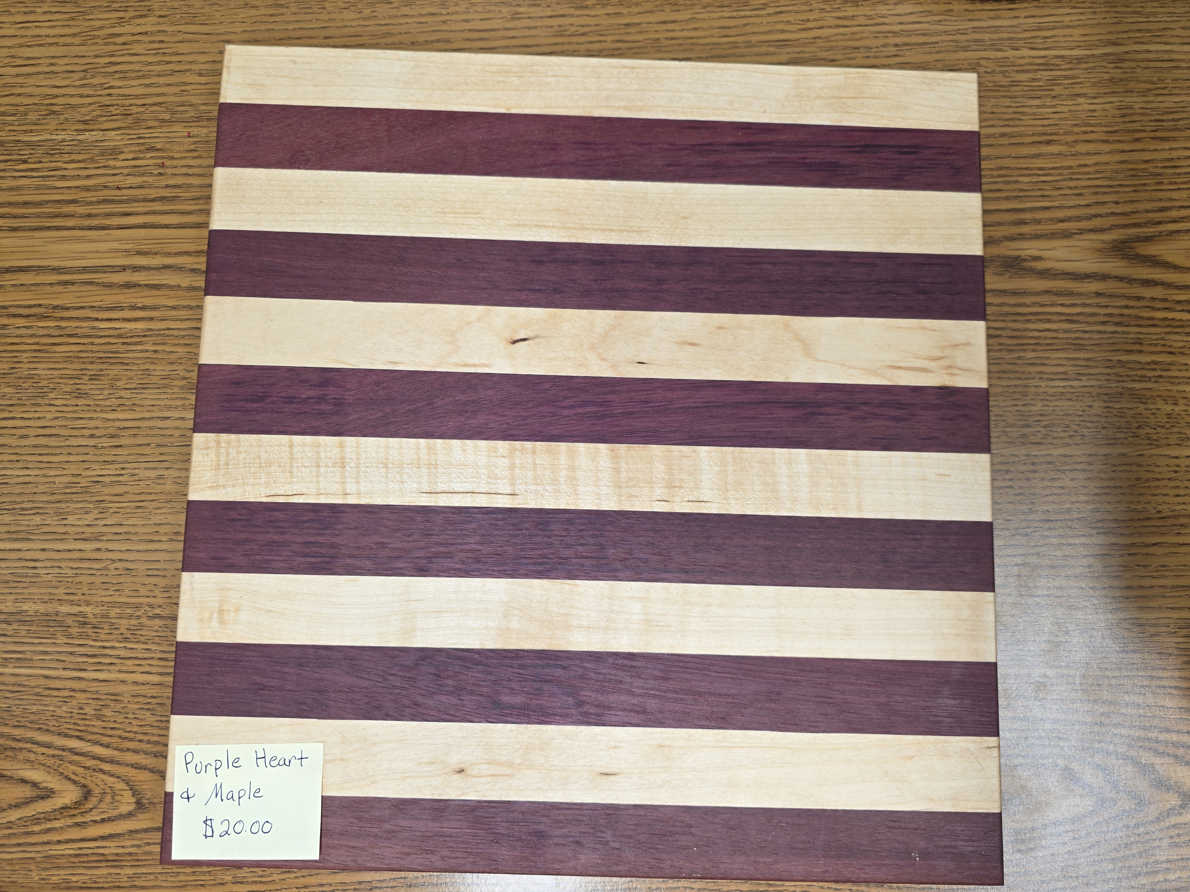 Cutting board made from purple heart and maple. Made by the students in woods class here at Wind River.