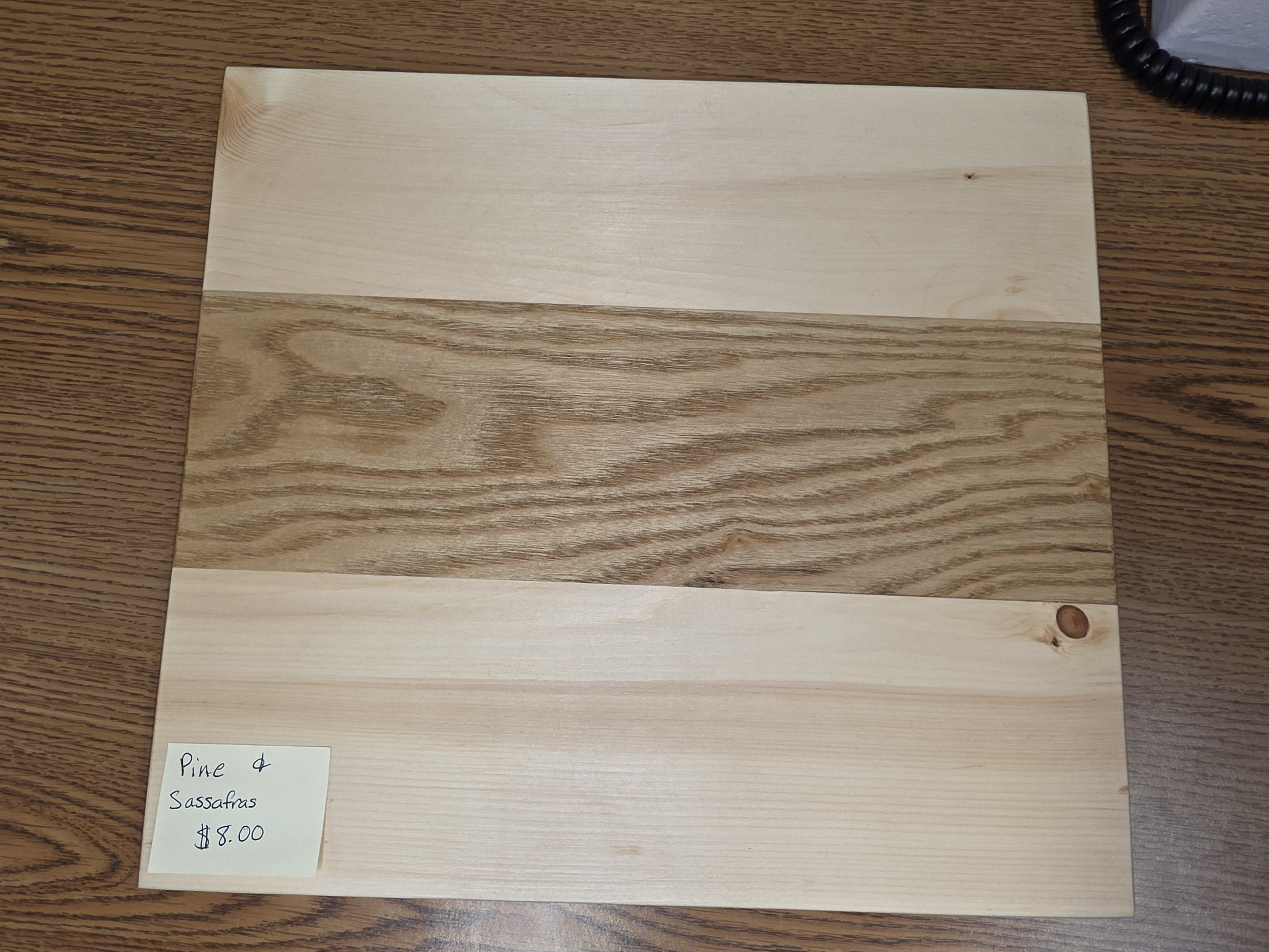 Cutting board made from pine and sassafras. Made by the students in woods class here at Wind River.