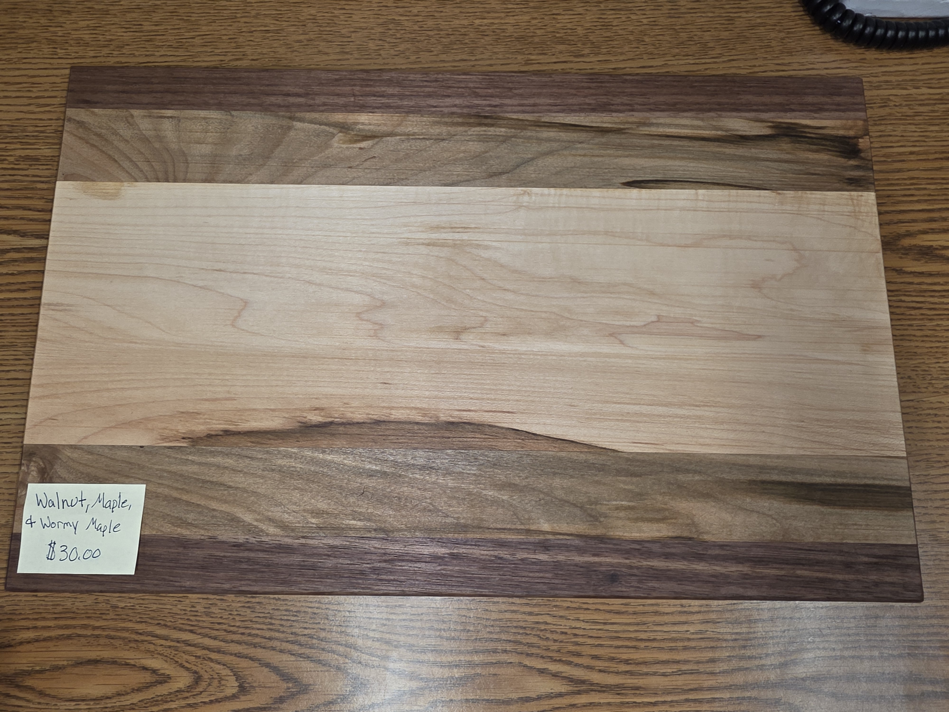 Cutting board made from walnut, maple, and wormy maple. Made by the students in woods class here at Wind River.