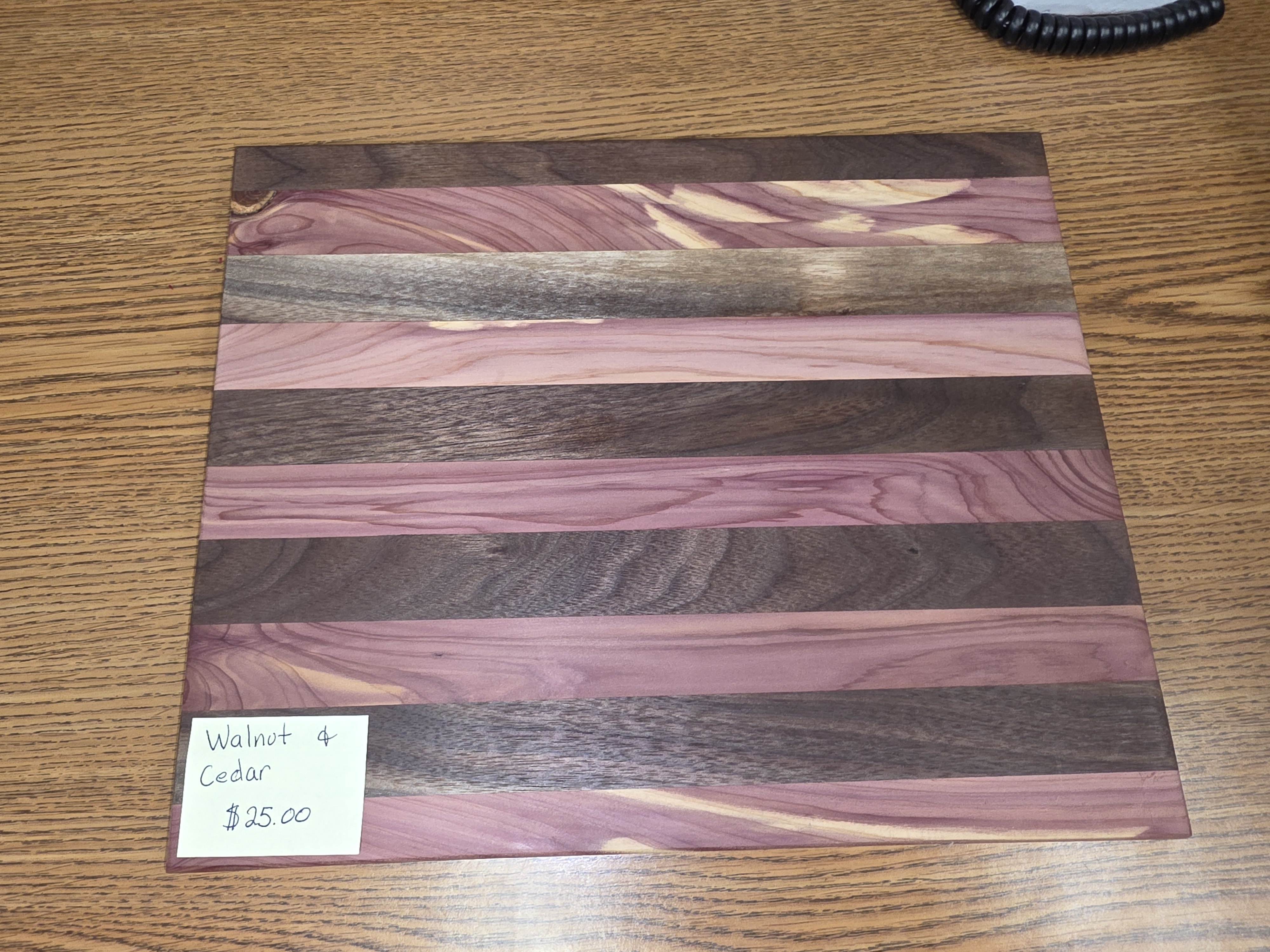Cutting board made from walnut,cedar,and red oak. Made by the students in woods class here at Wind River.