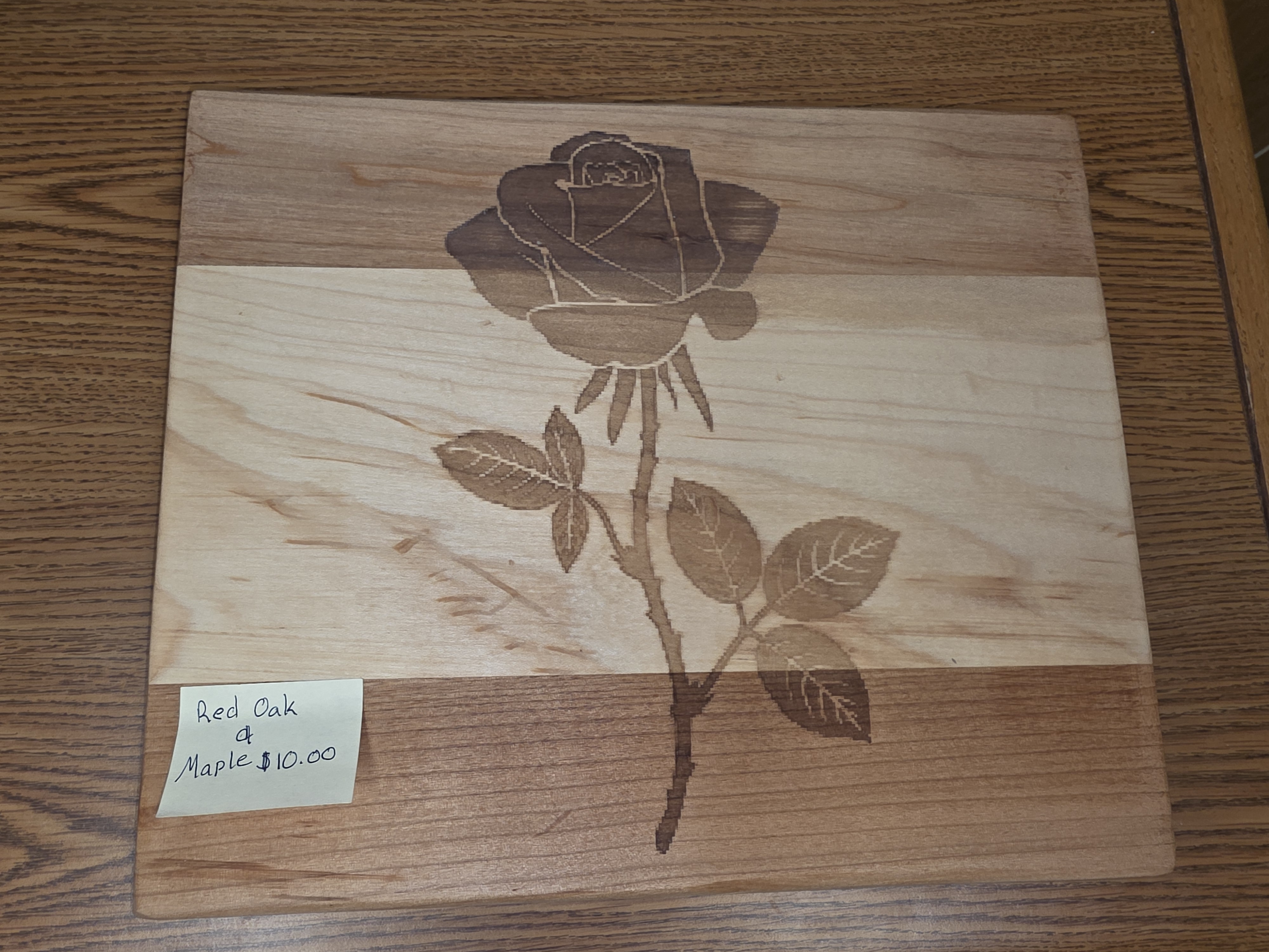Engraved cutting board made from red oak and maple. Made by the students in woods class here at Wind River.