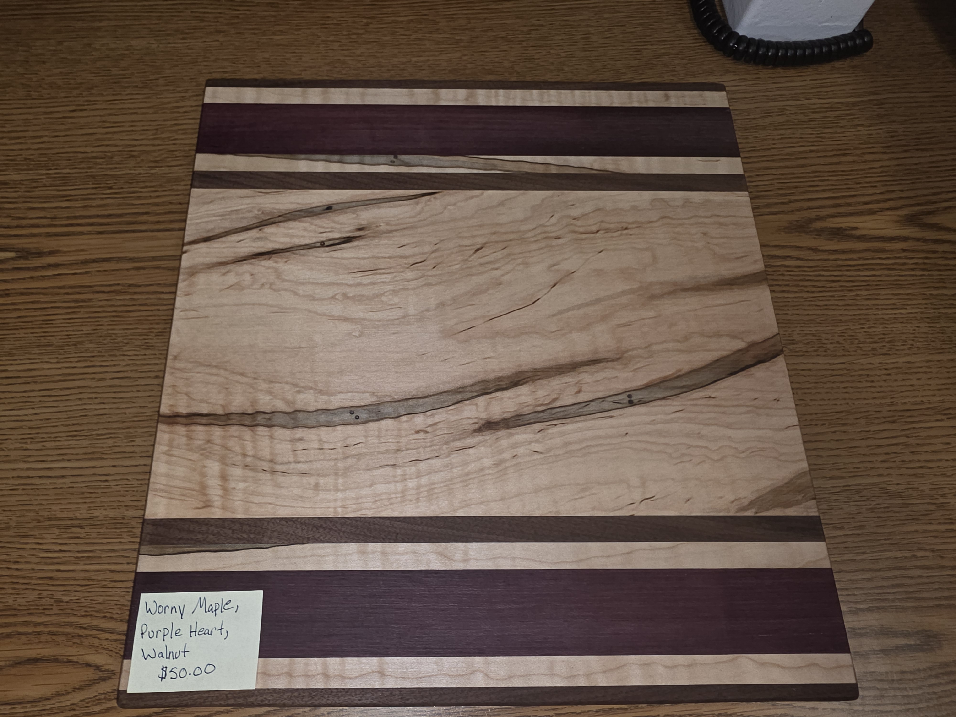 Cutting board made from wormy maple, purple heart, and walnut. Made by the students in woods class here at Wind River.